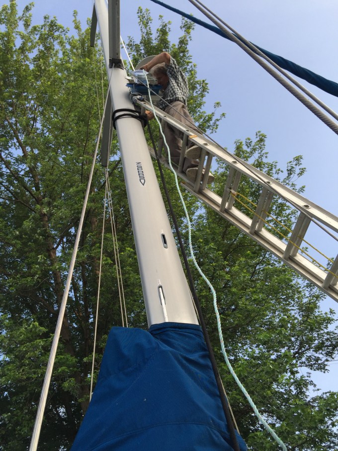 We are working very diligently on getting ready for our new journey. Bryce hoisted up our new radar and got it working, our ASI is wonderful… I love being able to look at all the different vessels and seeing where they’re headed. The following photos show Bryce working hard.
