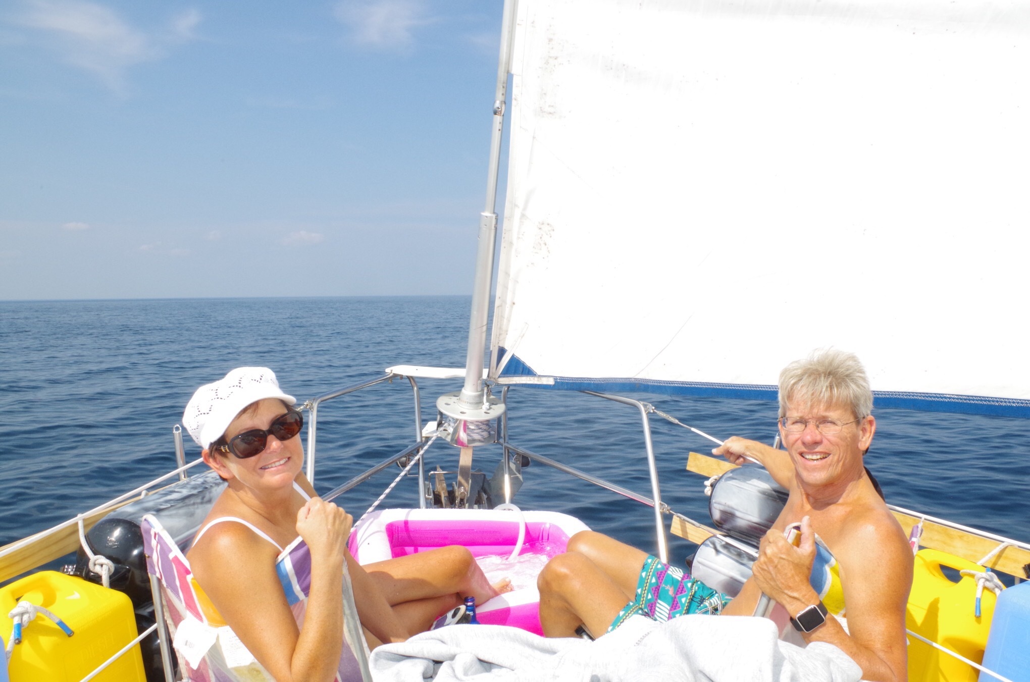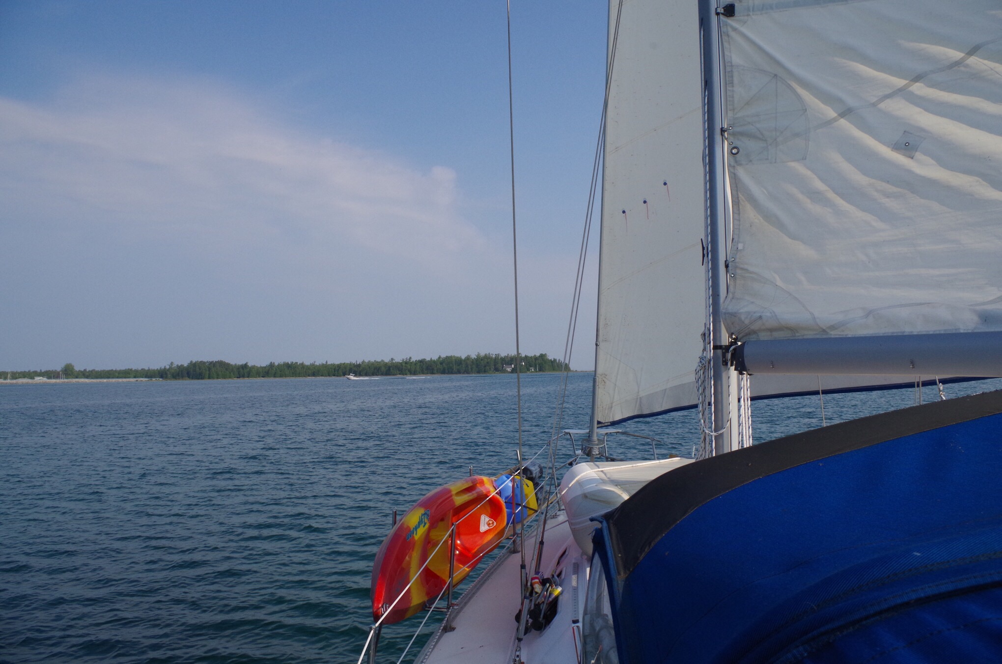 Ducan Bay is a nice bay for anchorage. Well protected except north east. The 57 mile sail from Presque Isle was fast.. Averaging about 7.5 mph. But quite warm.. Had to break out the pool