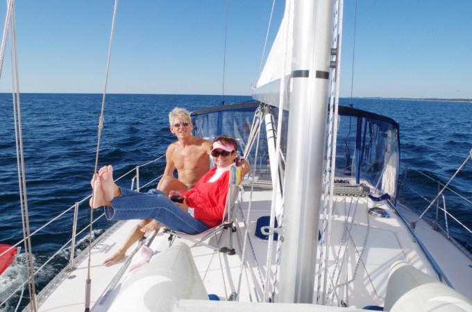 Relaxing on the bow while George takes our picture 😸 on our way to Saugatuck.. Best day sailing in Lake Michigan so far.
