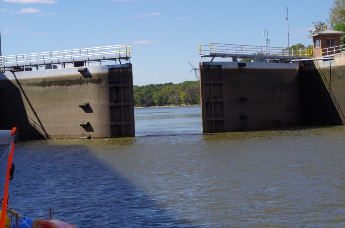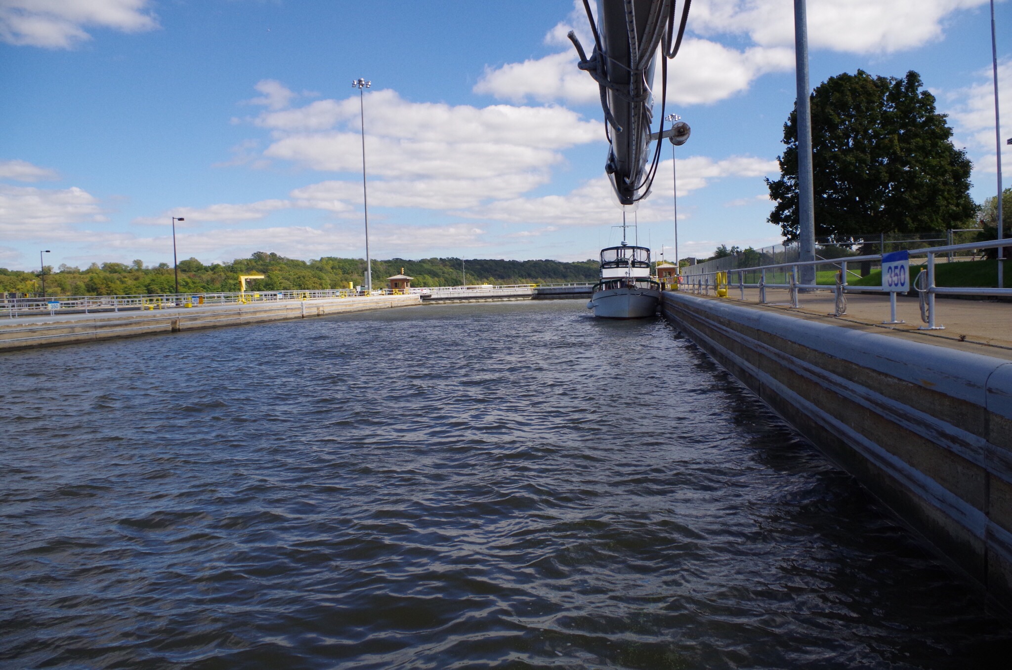 is "Marseilles Lock" it dropped us another 24 feet. We are headed to Ottawa Ill. There was a free wall to doc on but as we approached it our keel bumped bottom.