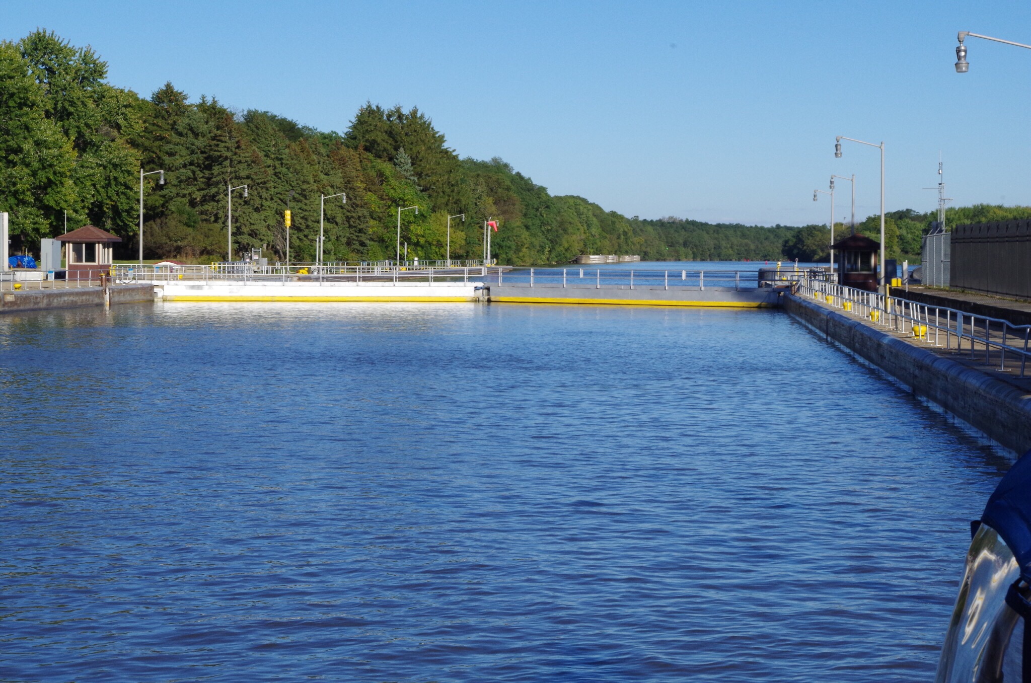 esden Island Locks lowered us 22 feet down (south) when the gates are completely open you hear a loud horn blast that means you can disconnect your lines and proceeded out with caution.<