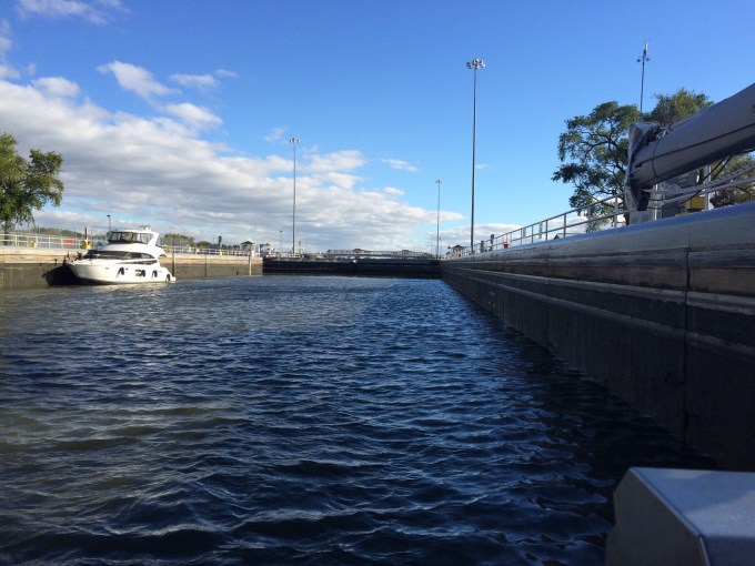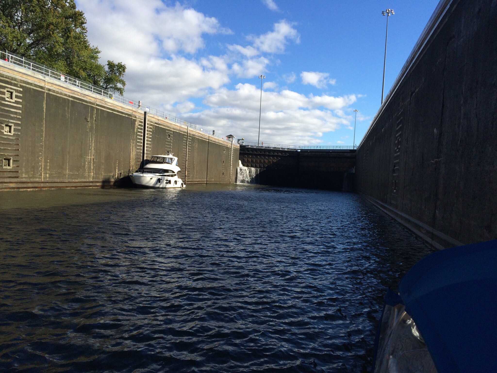 We shared the lock with two power boats this trip. We made it down 34 feet and are now exiting the lock.