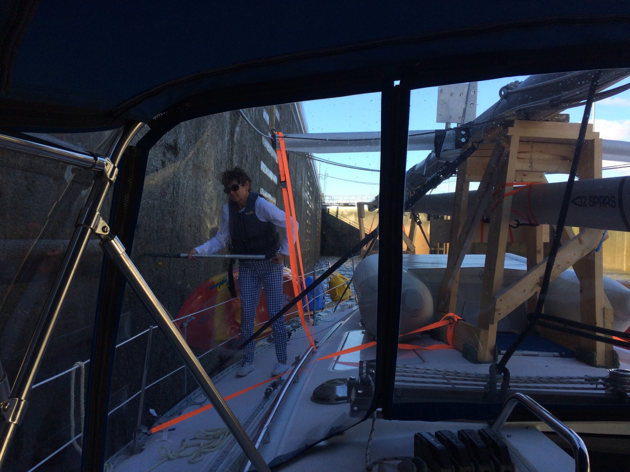 I had to use the hook stick to help keep our bow off the wall. It was very windy out as they lowered her down.