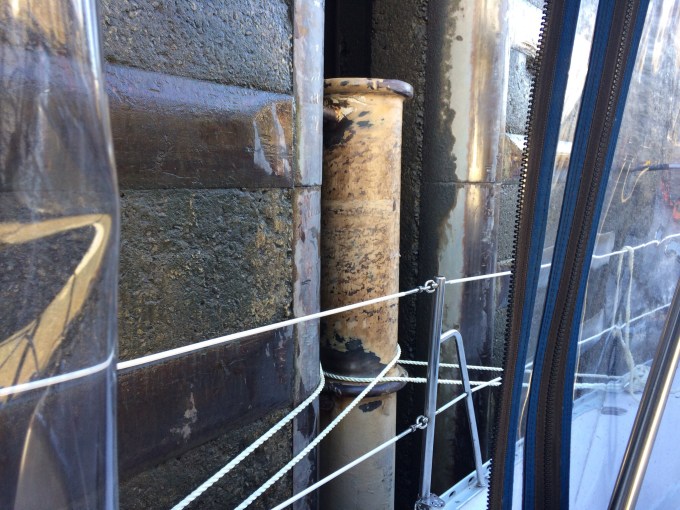 When we entered the lock we have to tie our spring cleat to this Bollard. Bryce also ties our aft cleat to it too, so Beauty doesn’t bump her mast (which is over hanging the bow and aft) into the locks wall. A bit of engine straightens her out.