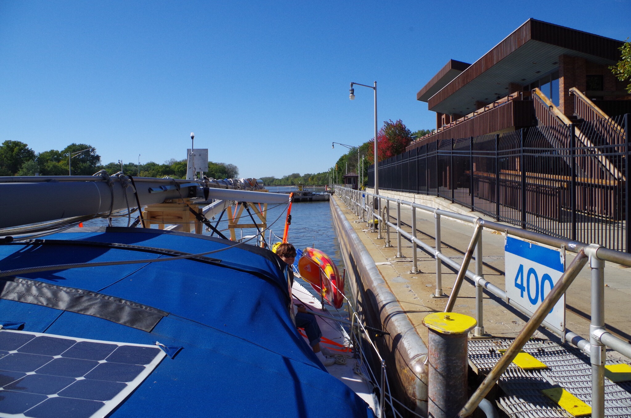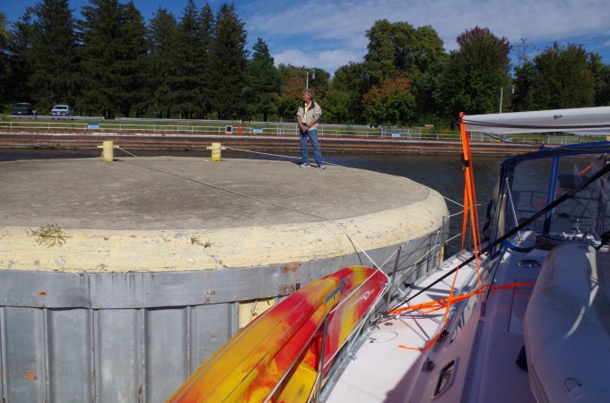 We announced to the lock master of our arrival. Once again he stated he wanted us on that concrete mooring. That thing was so huge! We docked up to it. Then he stated he wanted us on the other side of it! Now, let me remind you that winds were gusting at 26 miles an hour. We were not happy boaters but we switched sides.