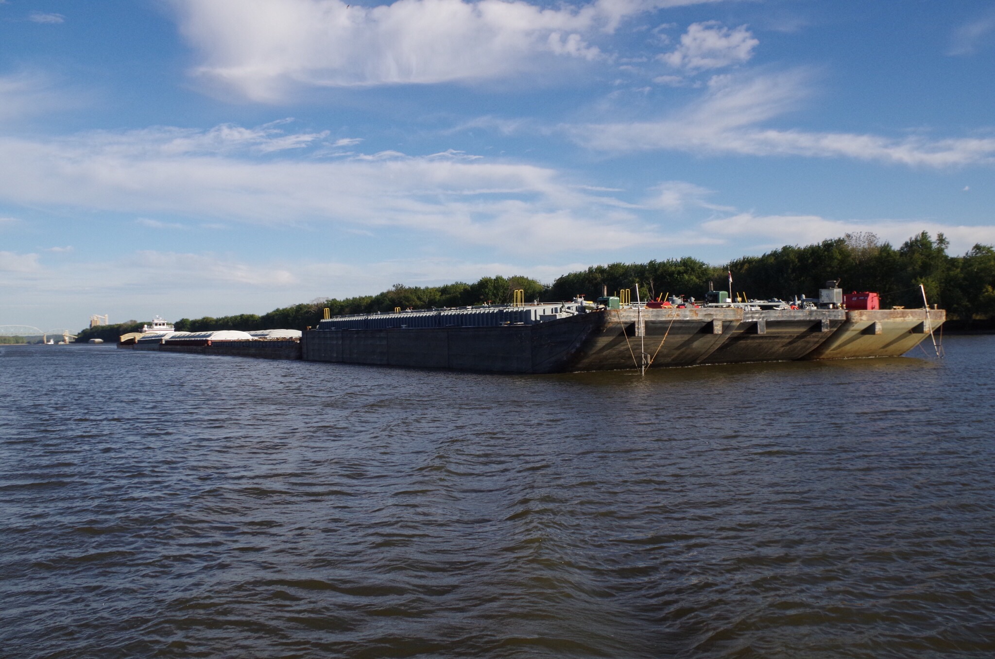 When the doors to the lock opened we were shocked that there was a three tow badge waiting to get in the the issue was they barely left room for us to get out! We had to go motor to there Port side (left) to motor out. I could darn near shake hands with the attendant on the bow. Just glad it’s over for now. 73 miles to the next one.