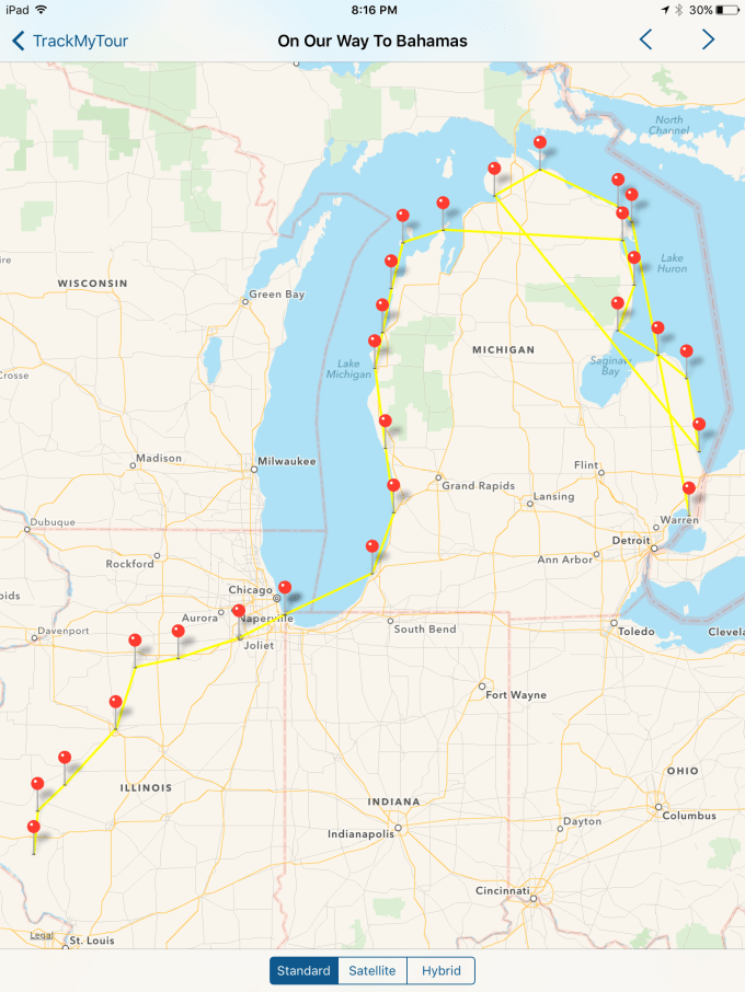 We thought some of you might want to see where we have been. All of the red dots are way points where we have either anchored ⚓️ or docked. We are really happy that we chose this route. Despite all the rumors of low water we decided to take the challenge and go for it. We started in Lake St. Clair, headed to Lake Huron, Lake Michigan to the Calumet River, Sag, Illinois River where we are now. On the average the water depth is 14 feet. However, getting into a marina on these rivers has not been a great success. We do call ahead to see what the water depth is and it’s always too shallow to take Beauty in. Bryce takes the dinghy into the marinas get diesel or water. We enjoy anchoring, so for us it’s no big deal not to get a slip it also saves on money. We need 6 feet to be comfortable and norally it’s 4 feet in the marinas? In Joliet and Ottawa they had city docks that we could use and they were free. This coming week we are planing on getting a slip in Grafton Illinois. I am going to do some heavy duty grocery shopping. We have gone about 1200 miles: 900 in the Great Lakes and about 300 in the Illinois waterways.