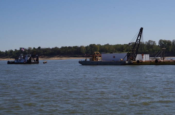 Finally, Bryce finished his morning to do list and we started on our way to the lock. Cruising up the river we noticed the pipe line layer. In this picture, a baby tow is helping to lift the anchor of the pipeline layer.