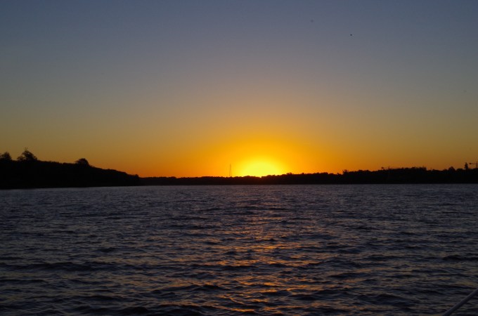 We anchored near Paducah Kentucky for the night; we were both exhausted. Our anchor alarm sounded around 4:30 am. The wind had swung us around toward shore so we pulled up anchor and headed up the Tennessee River to the Kentucky dam Lock. Here it is, our first sunrise on the Tennessee River.