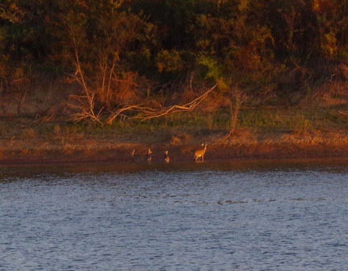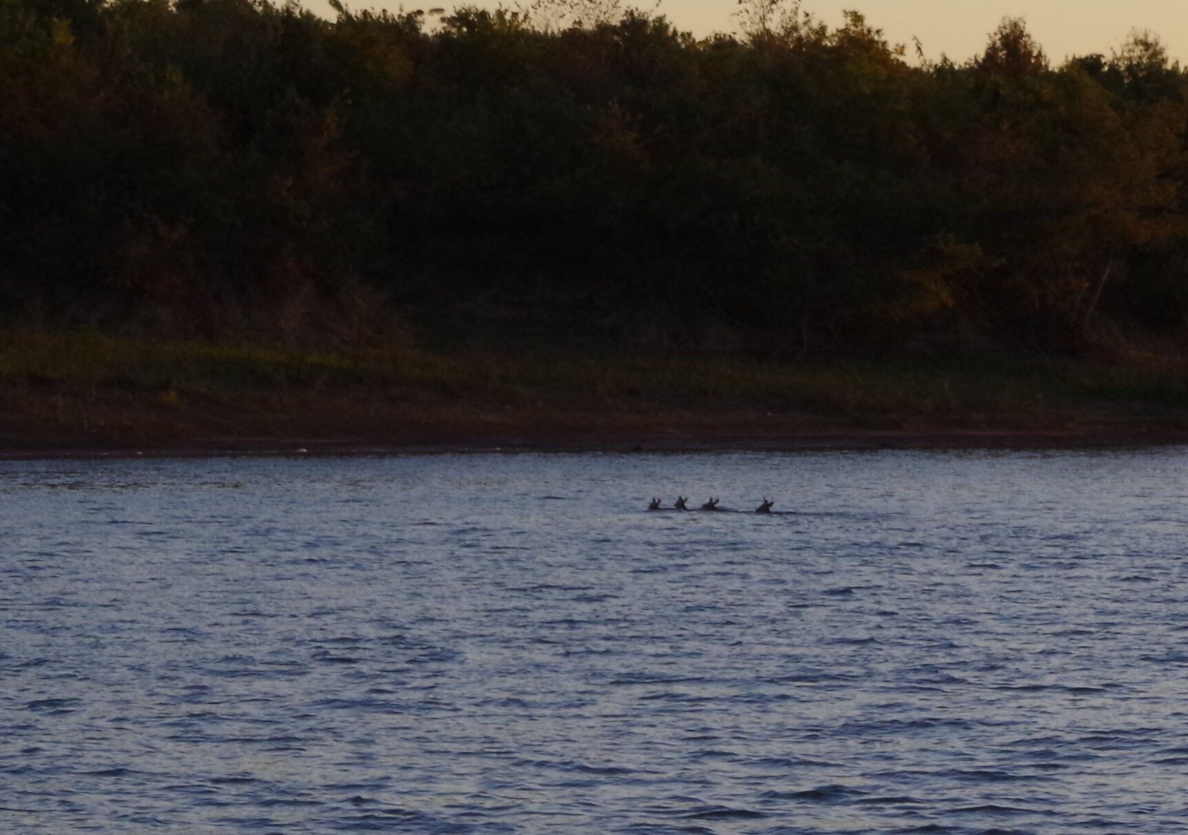 At first Bryce thought we had a tree branch headed towards us. Then he looked again. Jane he yelled. I was doing dishes. “Come quick, look there are 4 deer swimming across the river.”