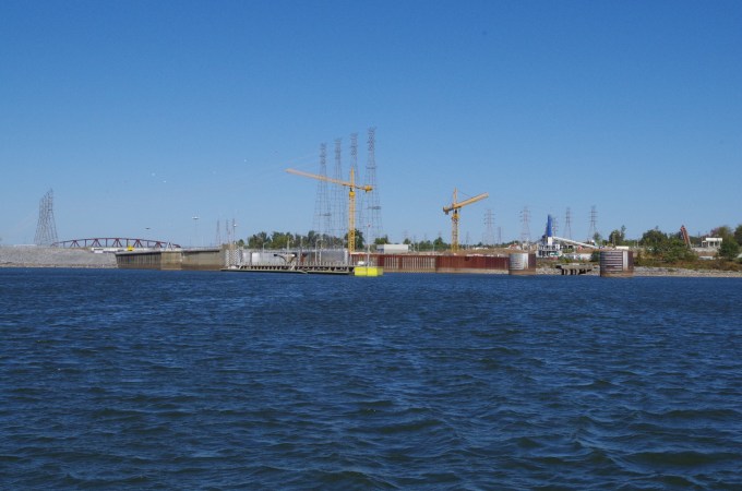 We made it through the Kentucky Lock without any issues and we did not have to wait. It’s a good thing we left at 4 am. At mile 22.5 the Kentucky lock lifted us 57 feet. The highest lift so far on our trip. It is a single chamber lock 110 x 600 feet. Because of the high lift the lock had some turbulence as the water rose. The lock master had us tie to the last floating bollards. The put us directly in front of the exit doors. They looked huge in front of us.