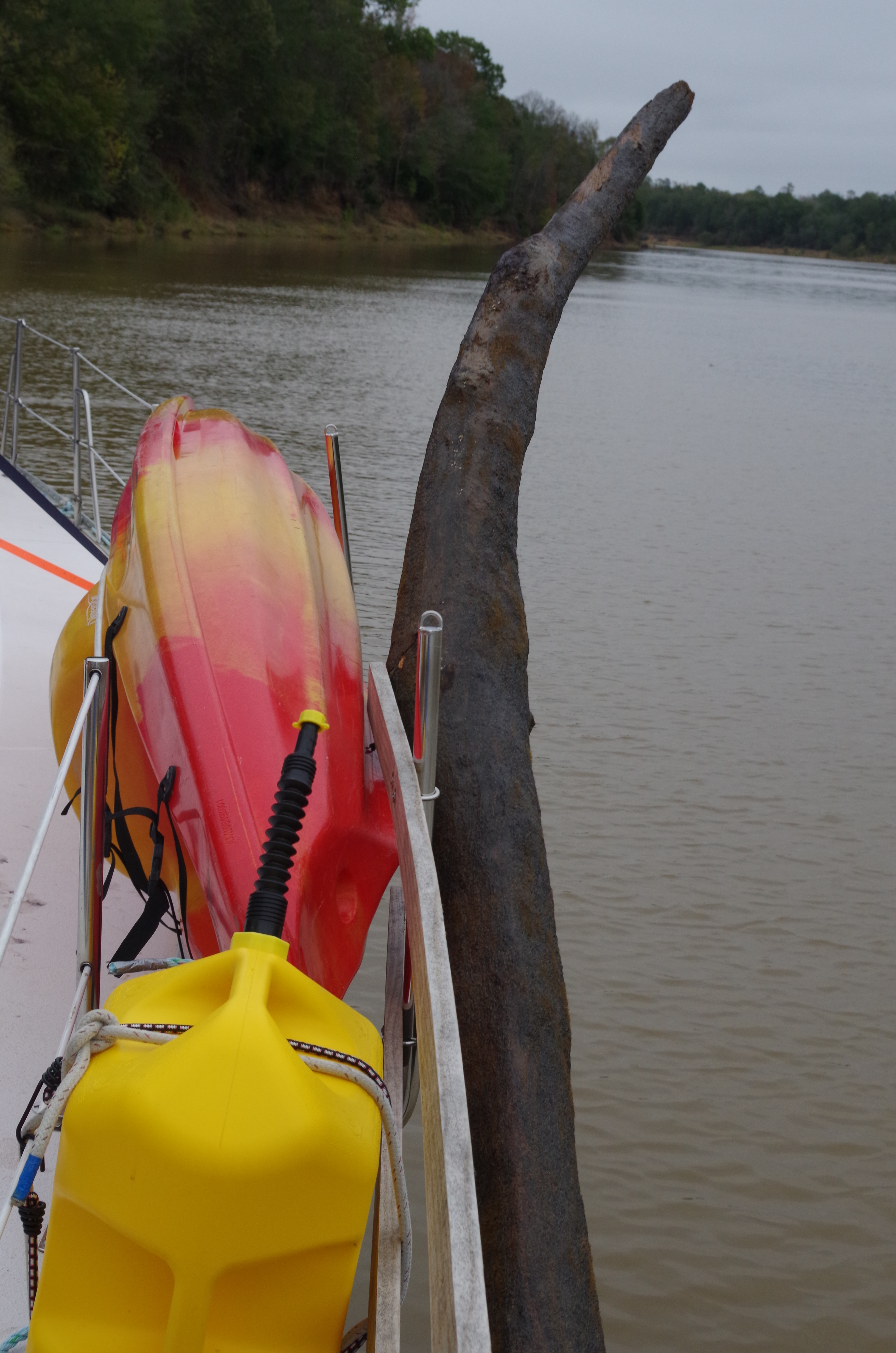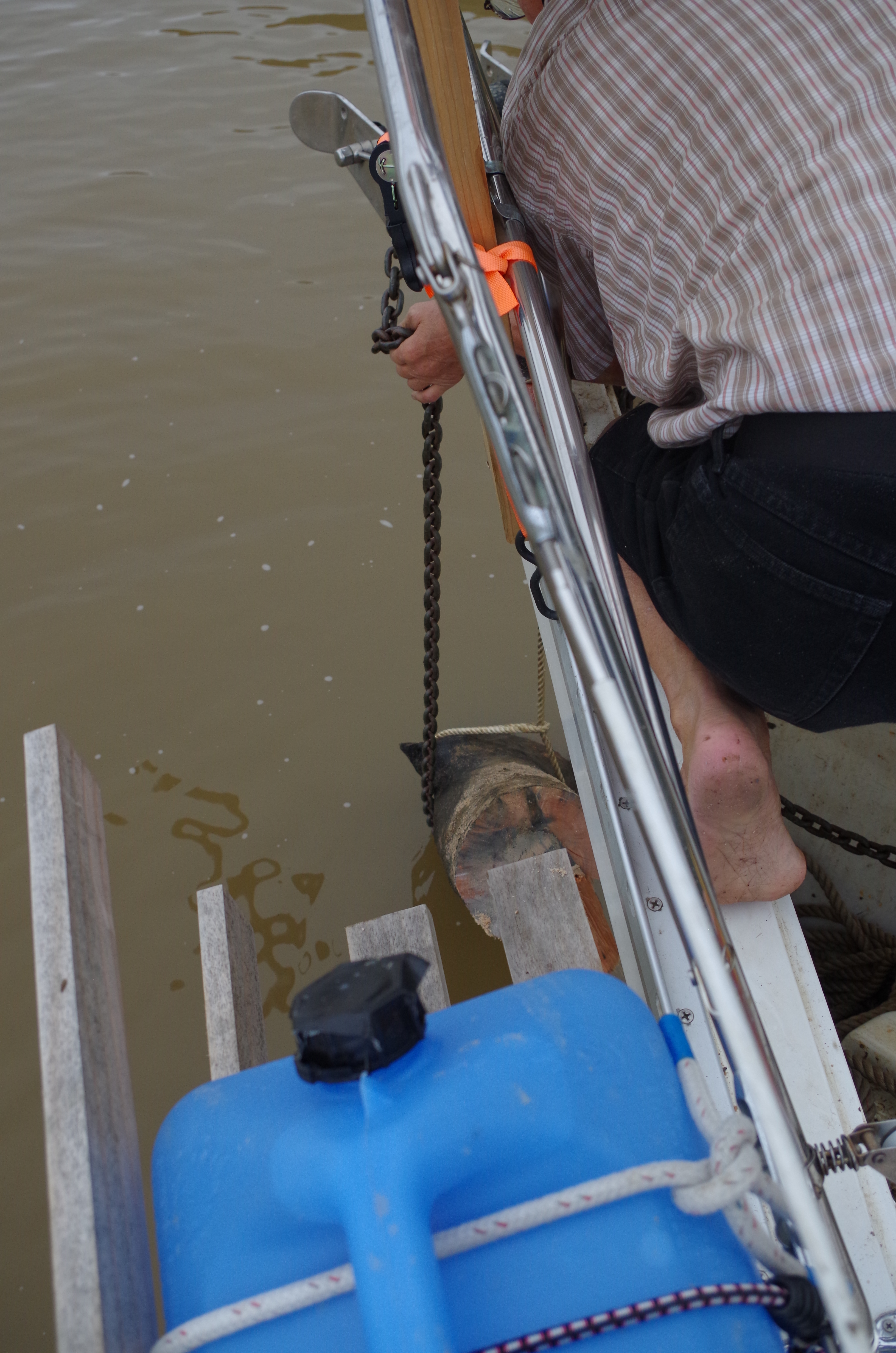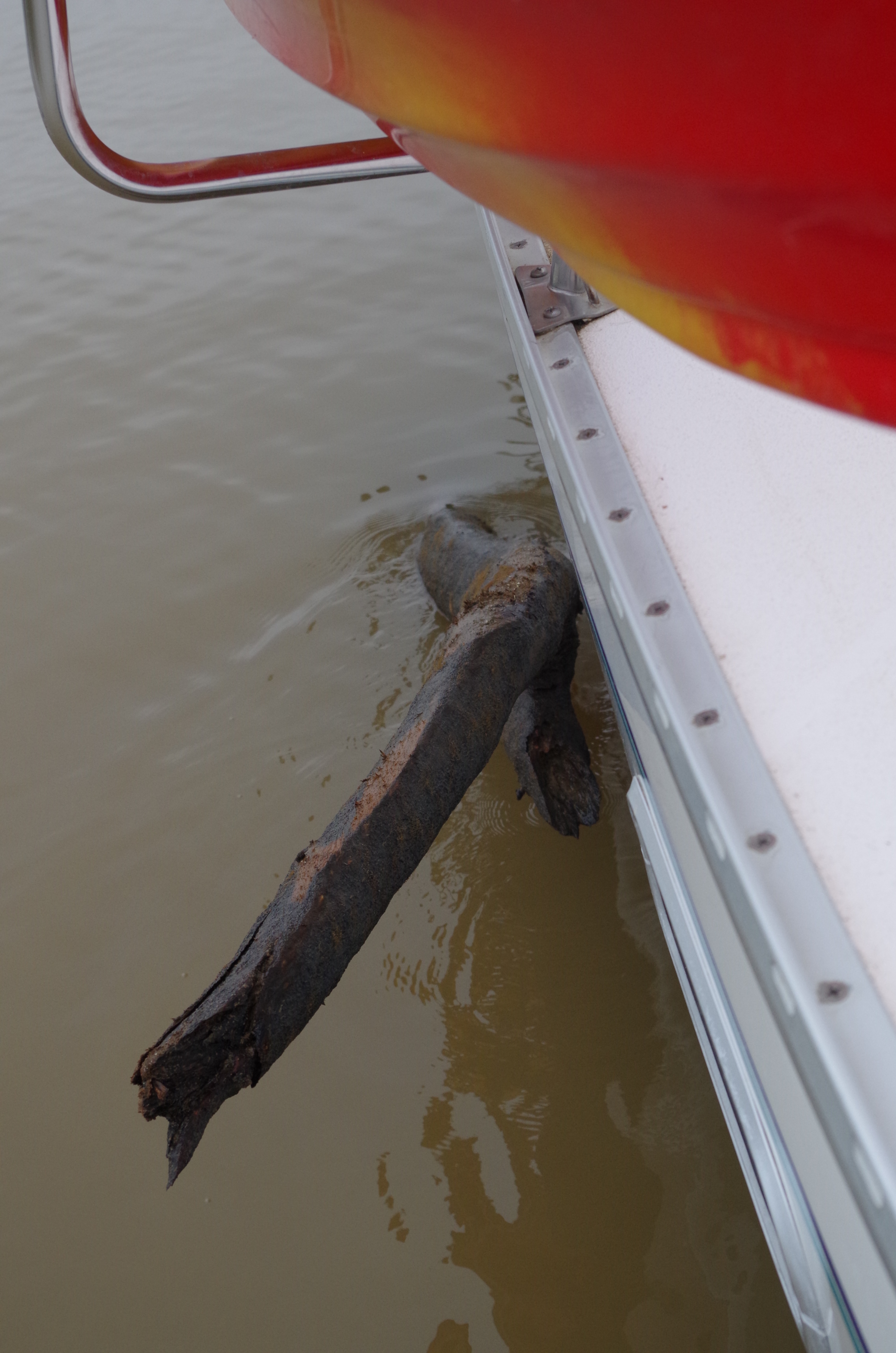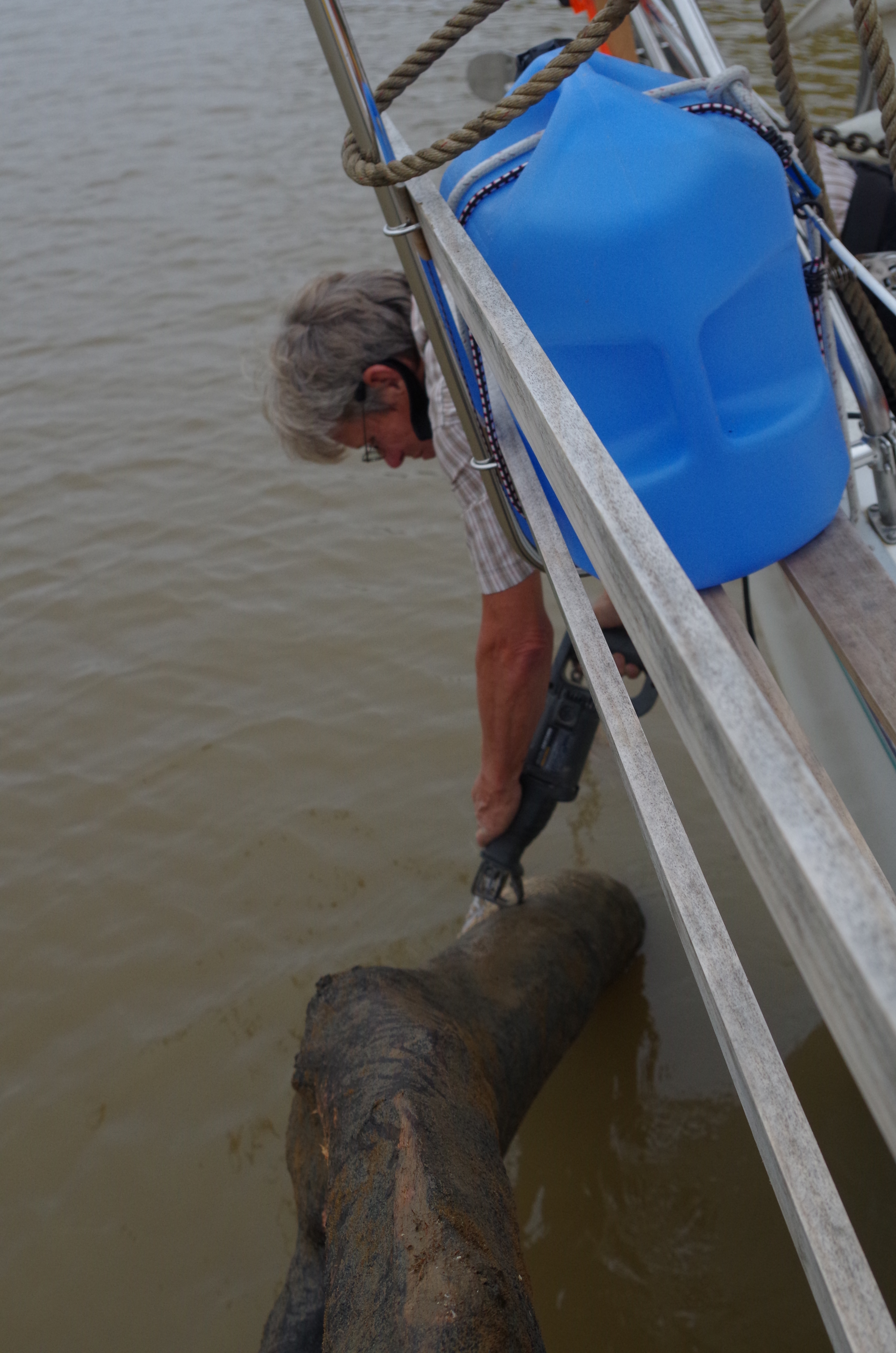 We are so excited that we didn’t use common sense. It was time to take off the line and bring in the anchor & chain. However, that didn’t happen! we took the line off. Too soon; it seems the anchor chain was also wrapped around lower down on the tree. If we had not removed the supporting line, we might have been able to unwrap the chain. No doubt, now it would require lifting the whole tree trunk. The thought of winching up the complete tree and floating down the river tied to a tree trunk was not a pleasing image.