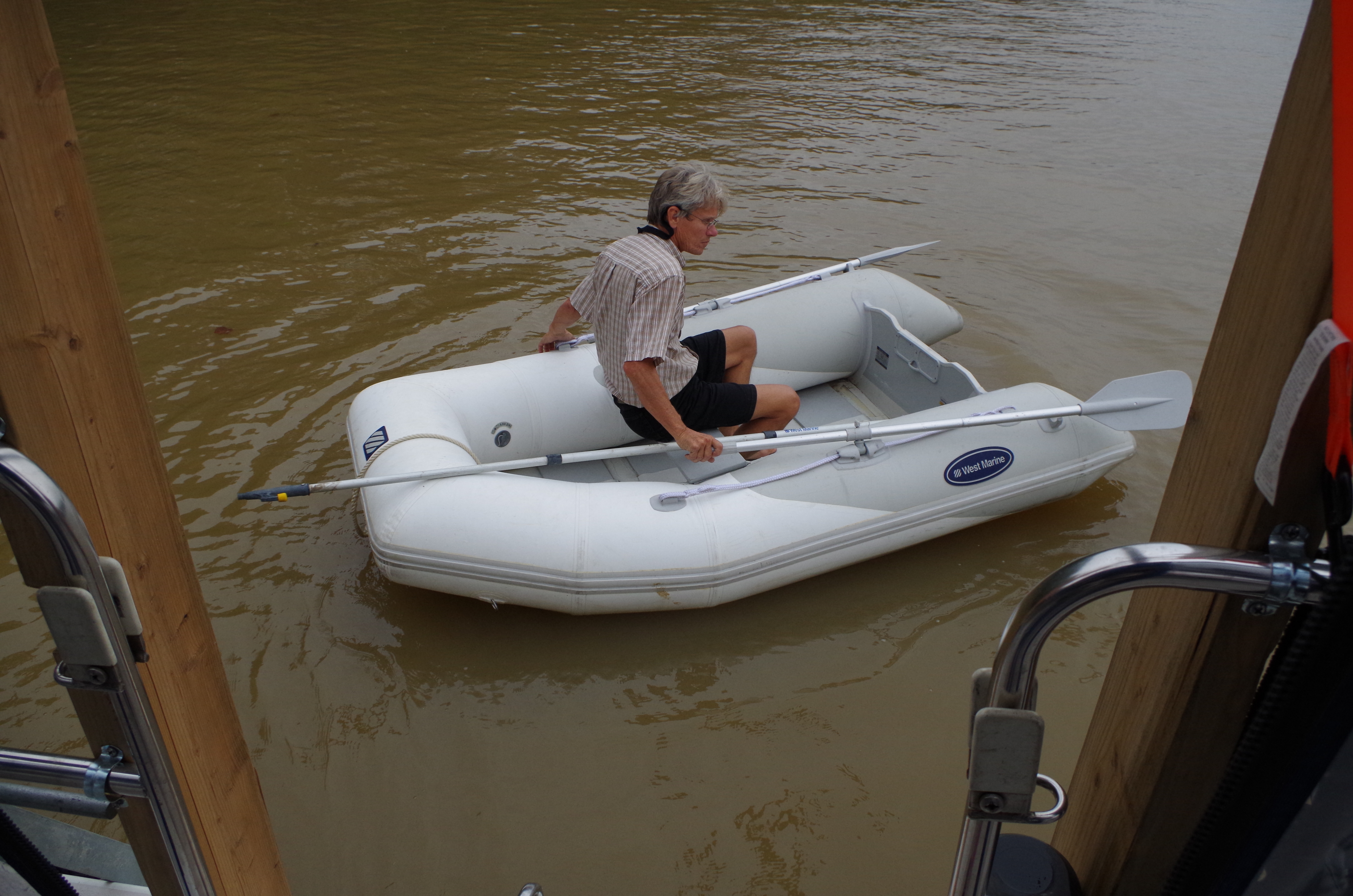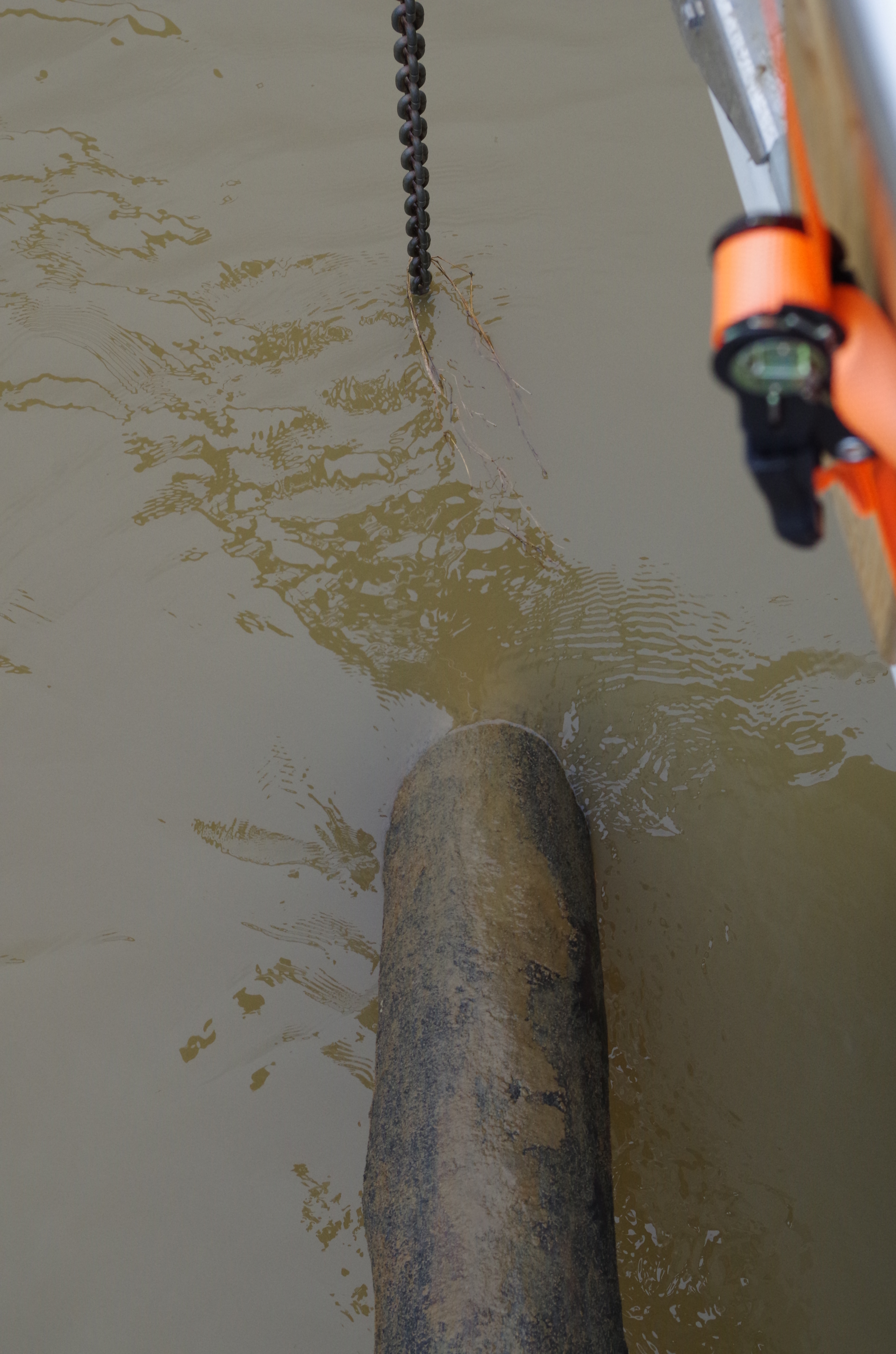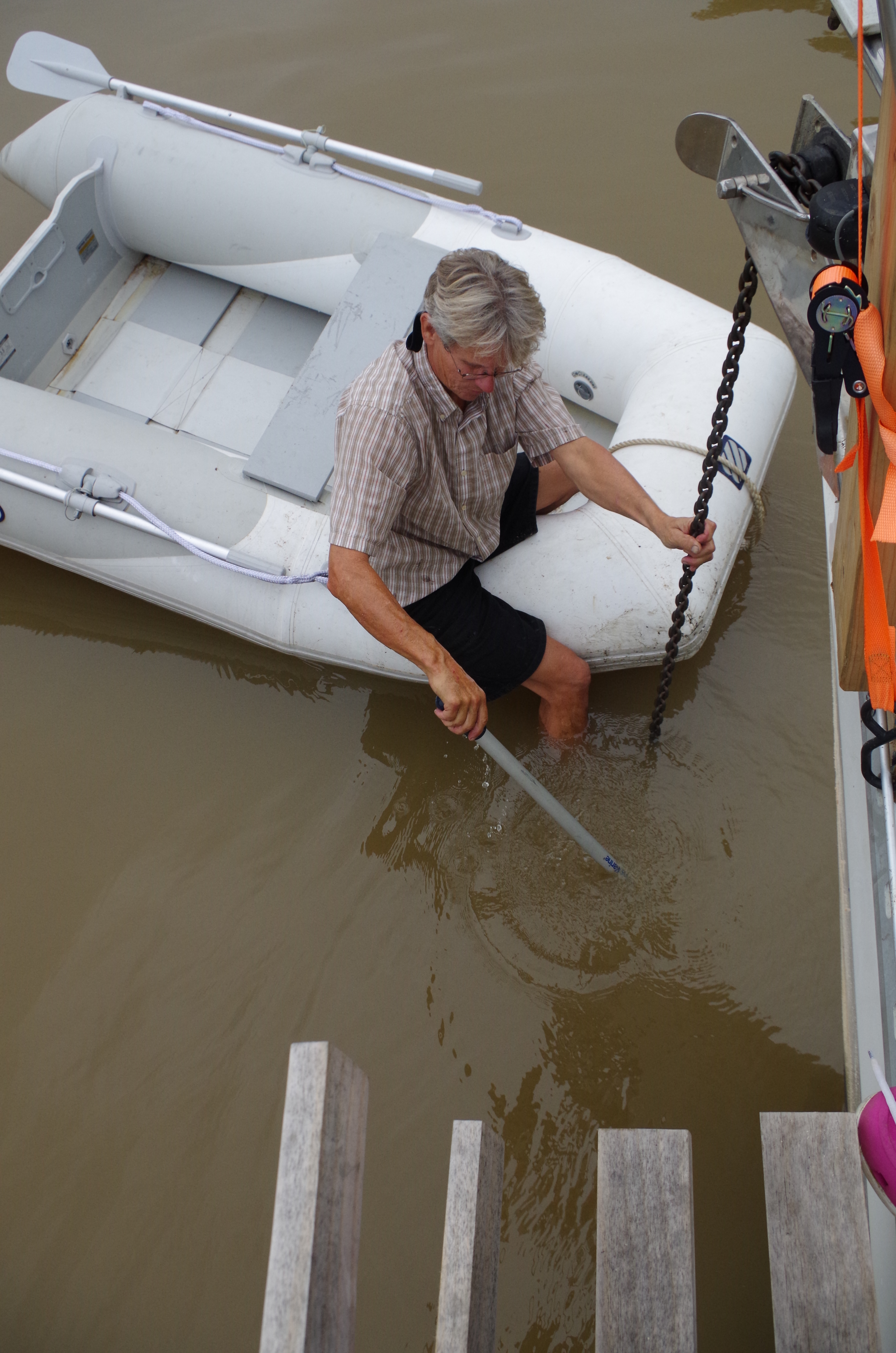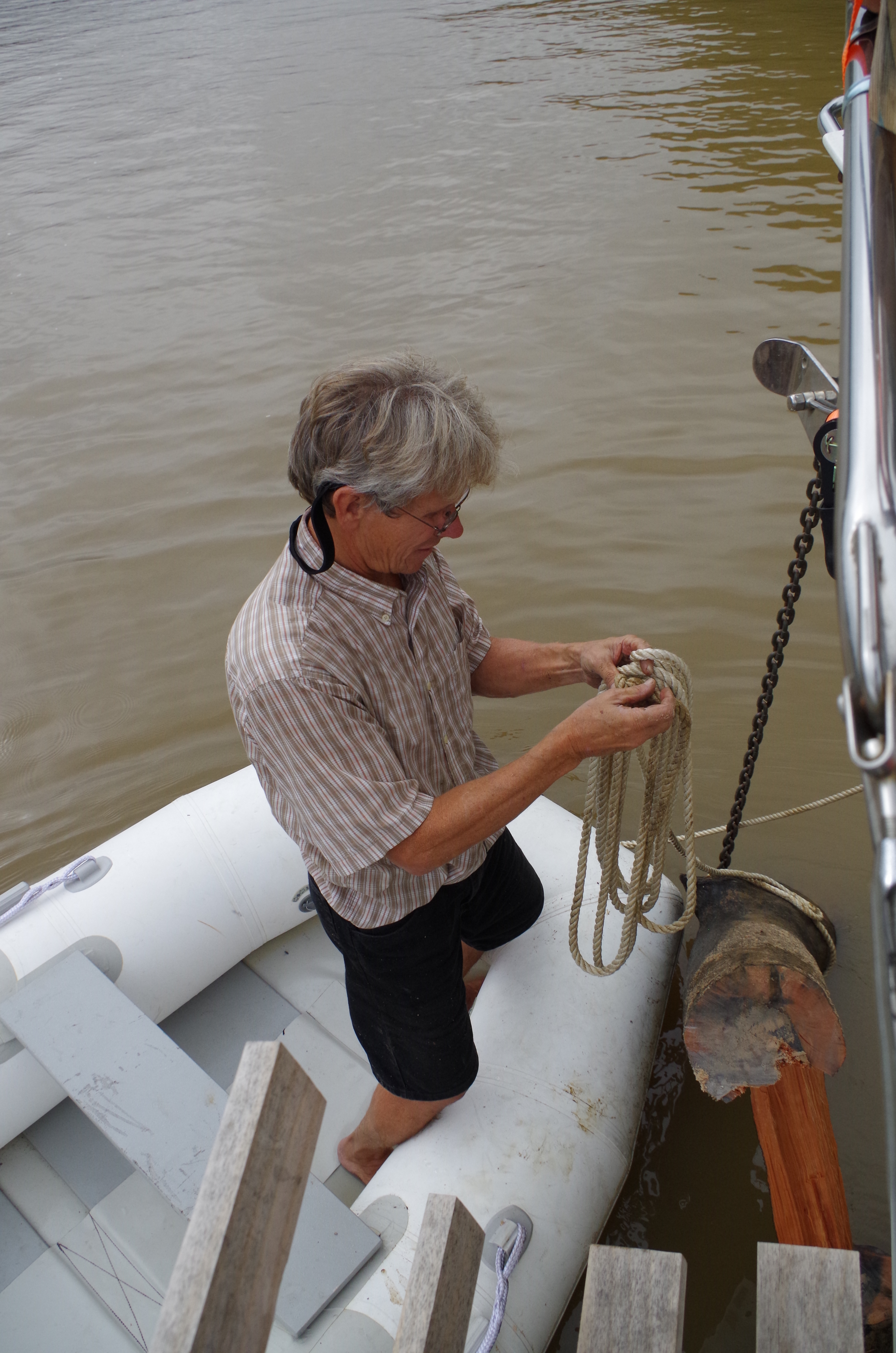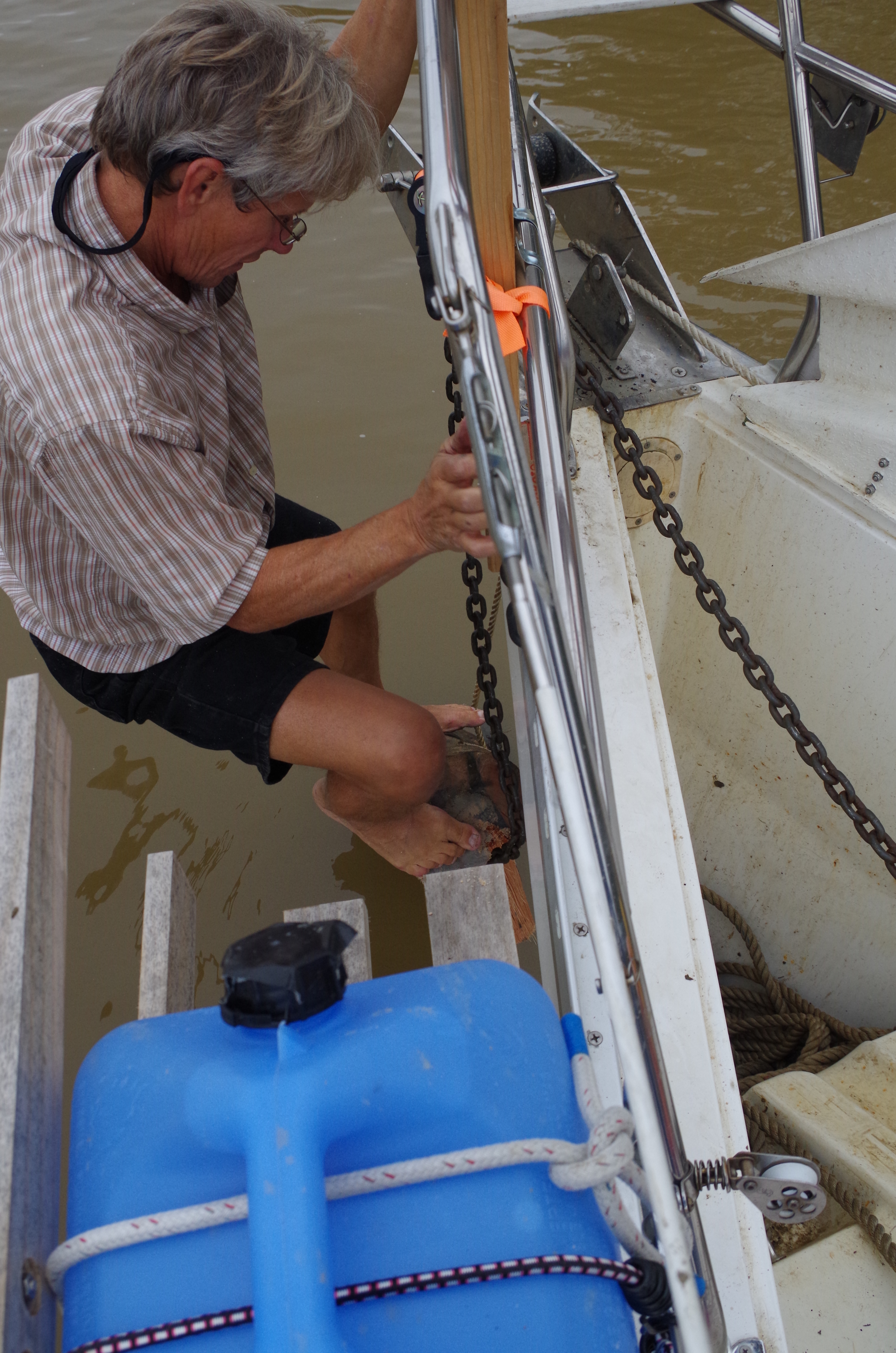 We are so excited that we didn’t use common sense. It was time to take off the line and bring in the anchor & chain. However, that didn’t happen! we took the line off. Too soon; it seems the anchor chain was also wrapped around lower down on the tree. If we had not removed the supporting line, we might have been able to unwrap the chain. No doubt, now it would require lifting the whole tree trunk. The thought of winching up the complete tree and floating down the river tied to a tree trunk was not a pleasing image.