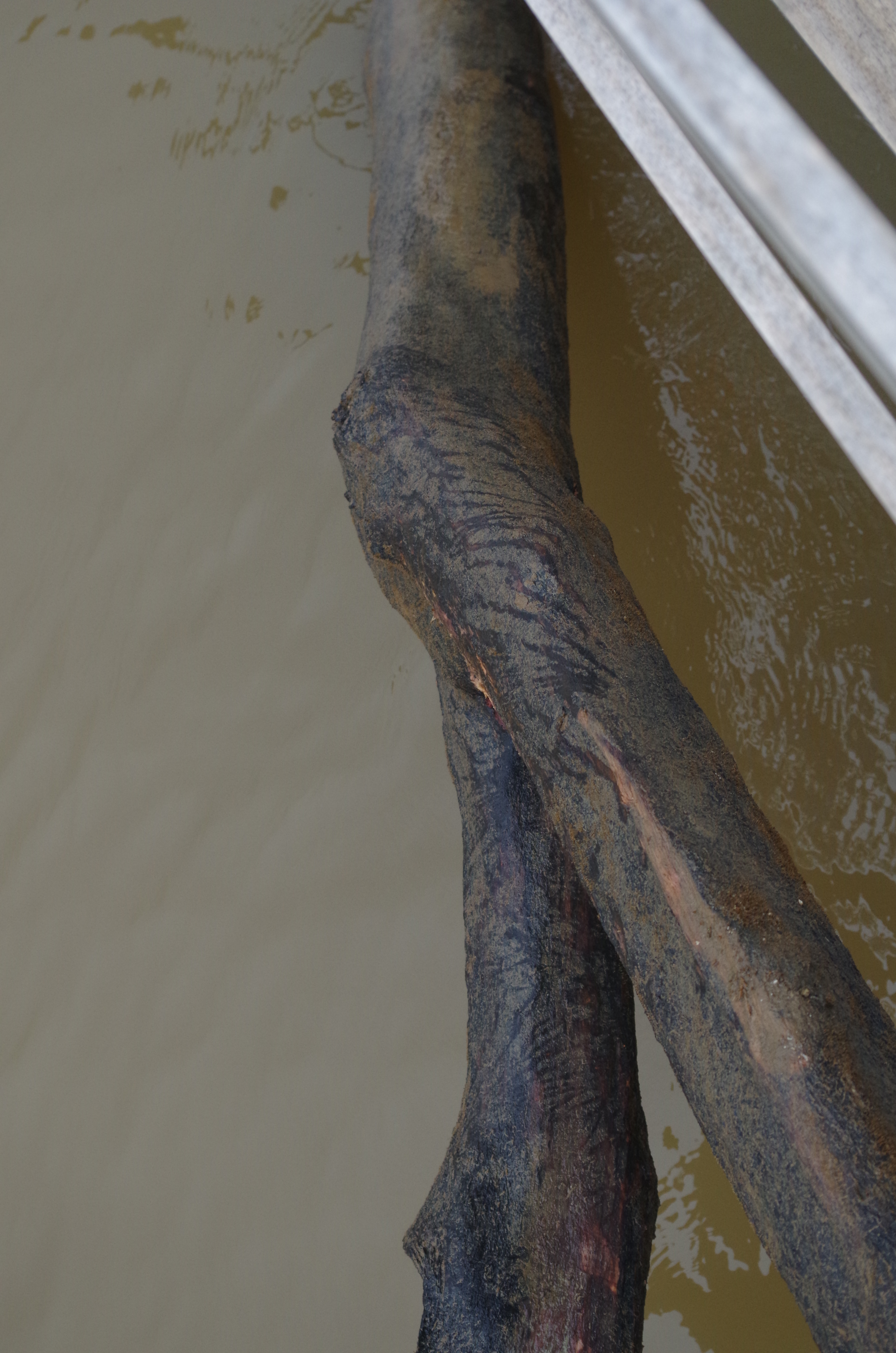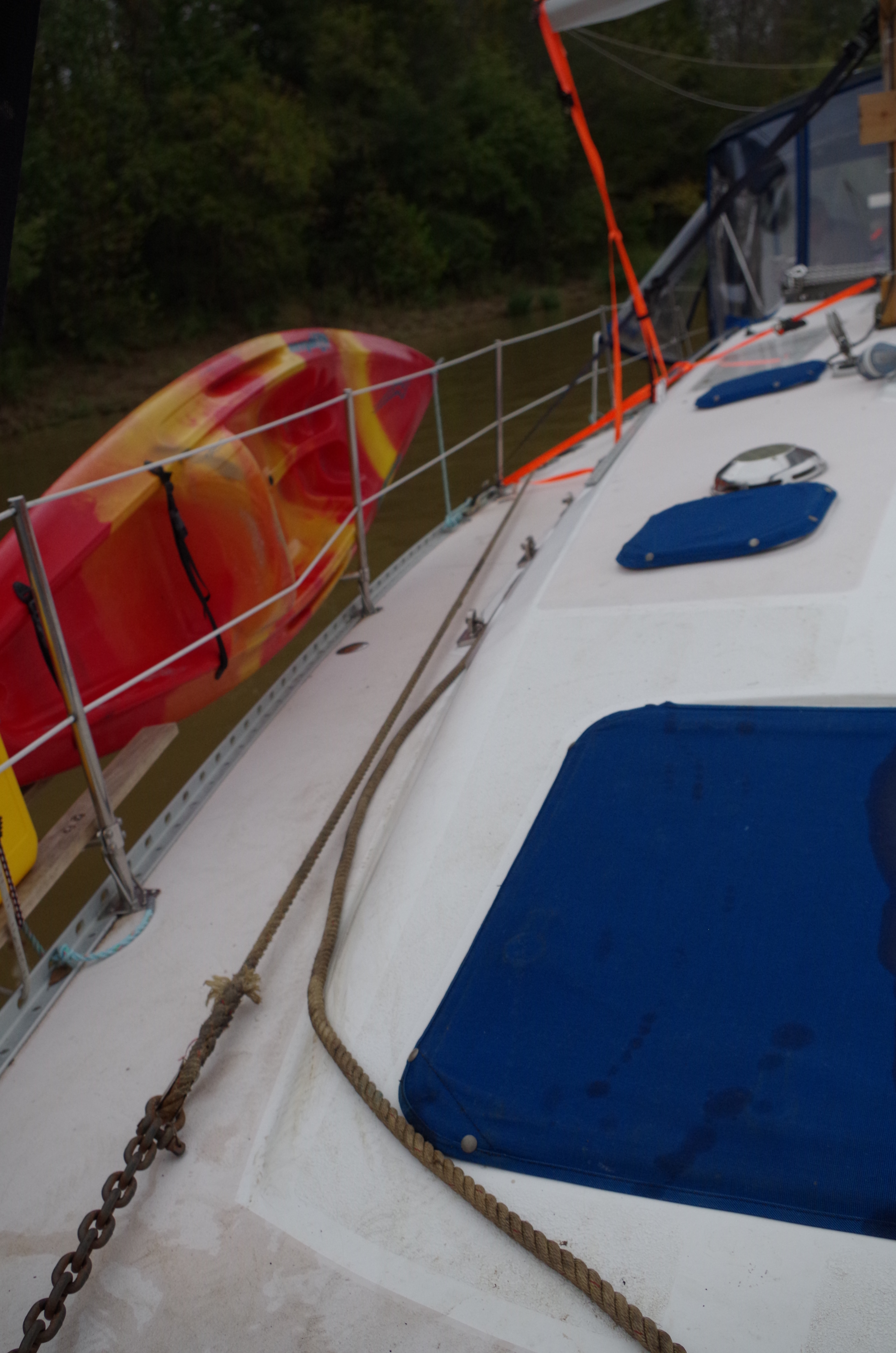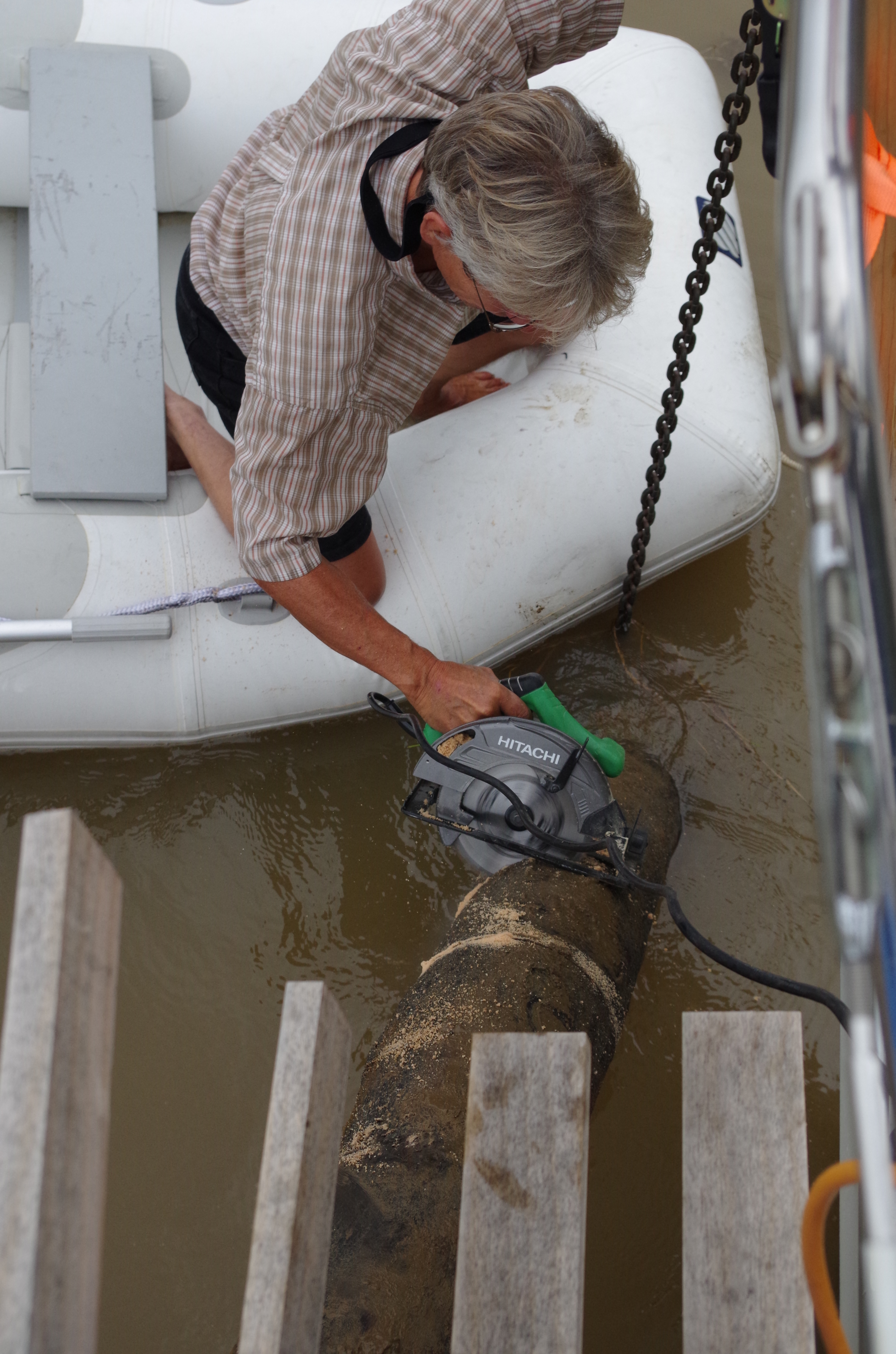You can see by this picture the chain is at the other end of the tree. It is time to start cutting so we can unwrap the anchor. Bryce started on the top side but quickly decided it would be better to use the dinghy.