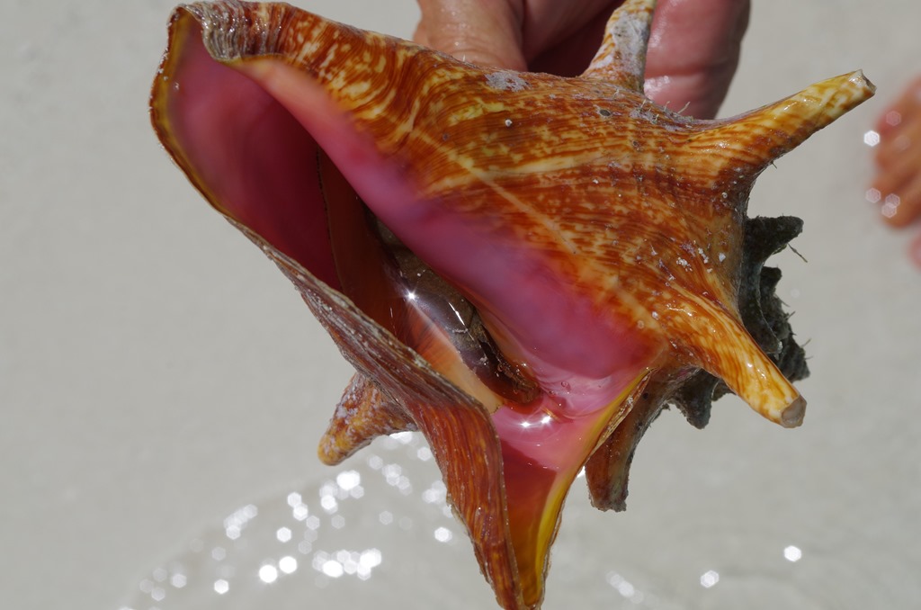 Have you ever heard of Conch? I never did till we got down to the Florida Keys. Now that I see one close up and personal… No! this is not going down my throat. We found a live Conch in the water on the beach.  It is a big thing down here. Later, we saw him crawling back in the deep water.  You can see his foot inside this shell.
