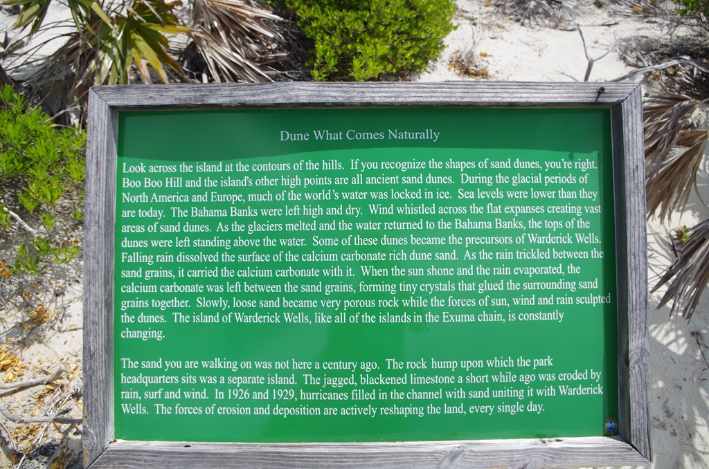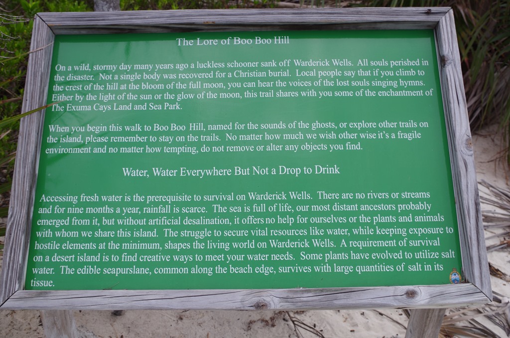 Good morning or Good Afternoon which ever it may be. We just wanted to share our stroll along the Blow Hole and Boo Boo Hill trail here at Warderick Wells Cay, Land and Sea Park.  I have to laugh, We pulled the dinghy upon to shore and the sign read $10.00 to park dinghy and $10 a person to help persevere the park.  For all our boater friends the anchorage here is great nice sandy bottom. They also have mooring balls for $30 dollars a night. If you are 90 feet or longer you have to pay $200 dollars a night just to anchor in the bay. What we found amazing is there are mooring balls throughout the area between all the different Islands. We are cheap; we just anchored and it was fantastic.