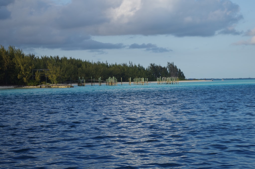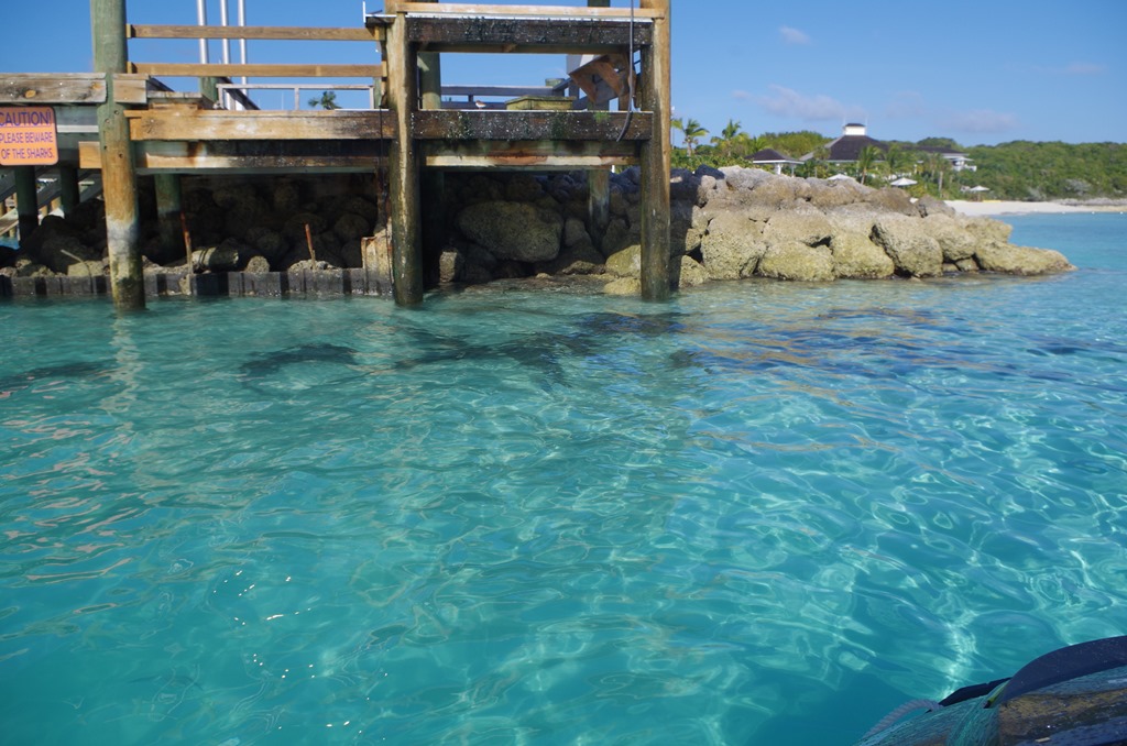 Leaving Black Point last Tuesday to make it back up near the Exumas Park we left in 15 knots winds and some waves. I learned one thing in the Bahamas Bank headed north, a 15/17 knot wind coming from the East is your friend. We had the best sail yet. But there is one thing we didn’t do. I owe Eva & Uwe an apology. We had one of our best nights with you two and didn’t even say good bye. Anyways, Safe travels our friends. We made North of Highborne and anchored near the Cay. We took a jet ski ride into the marina to check out the fuel docks and other accommodations. The attendant told us they were out of diesel but a barge would be in around 7 a.m. in the morning. I have to chuckle; the sign on the dock said” Beware of our Sharks”. I thought it was a joke. Then Bryce pointed at a huge dark spot. There was at least 8 sharks. Well, I wasn’t going swimming.