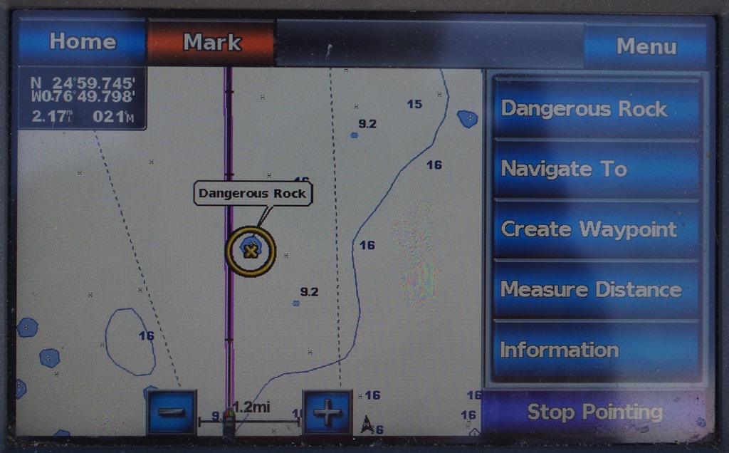 Bryce came up and said the GPS says we are going into a dangerous rock area! Now, for those of you who don’t know how to read a GPS, the pink line is our intended trail (sailing Line) to be correct. I didn’t think anything of it; looks like we will miss it. When you read the chart notes, it says: “Unsure of position or depth”. So we do not know if these rocks are 1 foot below or 20 feet below. We also do not know if the plot is correct. The water depth in this area was 22 feet.