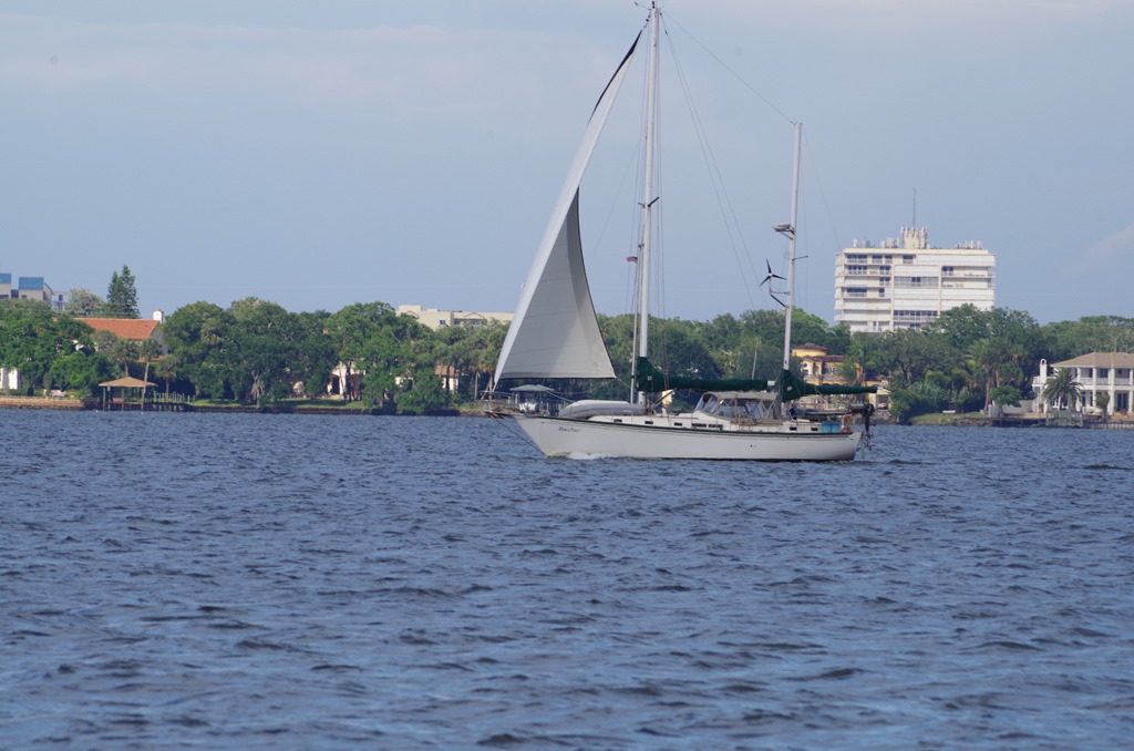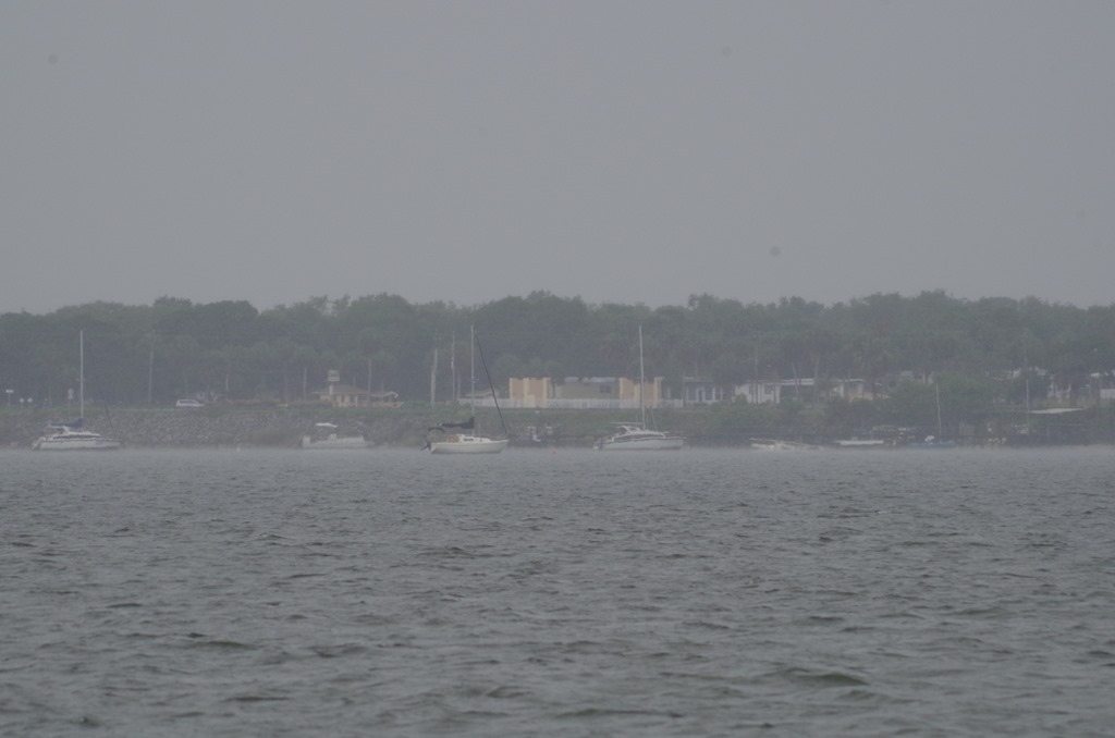 So we continued on up the river a few more hours and anchored near a bridge by Melbourne. Winds were WNW 15-30 MPH most of the night and throughout the next day. This is the boat that followed us throughout the day in the rain. As we dropped anchor for the night, she pasted us by.