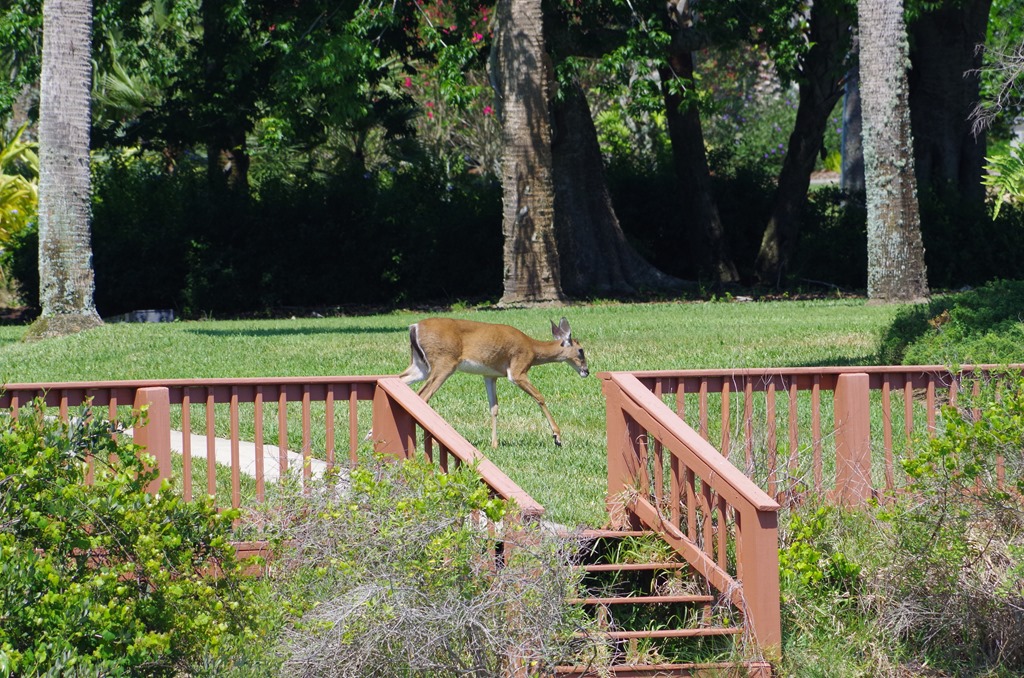 Look a deer right in the back yard of a well manicured yard. How pretty.