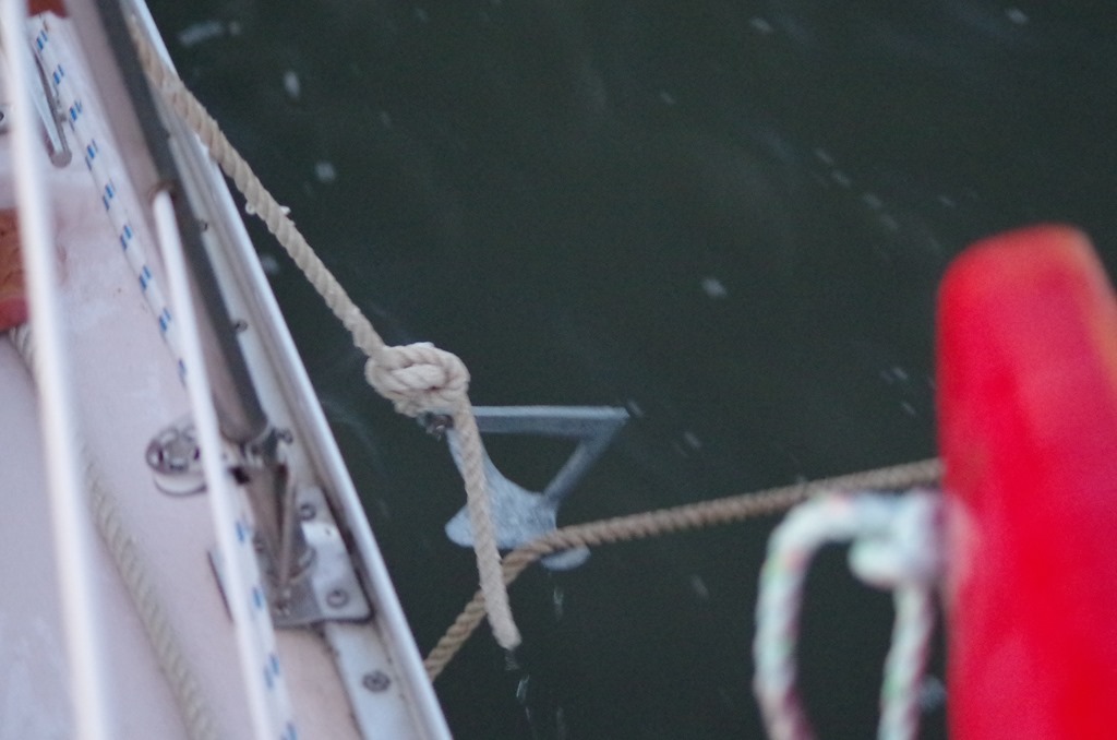 Prior to disconnecting at the bow, Bryce had to snag the line down line of the keel. He used the jet ski anchor to snag the line so he could tie it to the springer cleat. He then disconnected at the bow and pulled it past the keel from the springer.