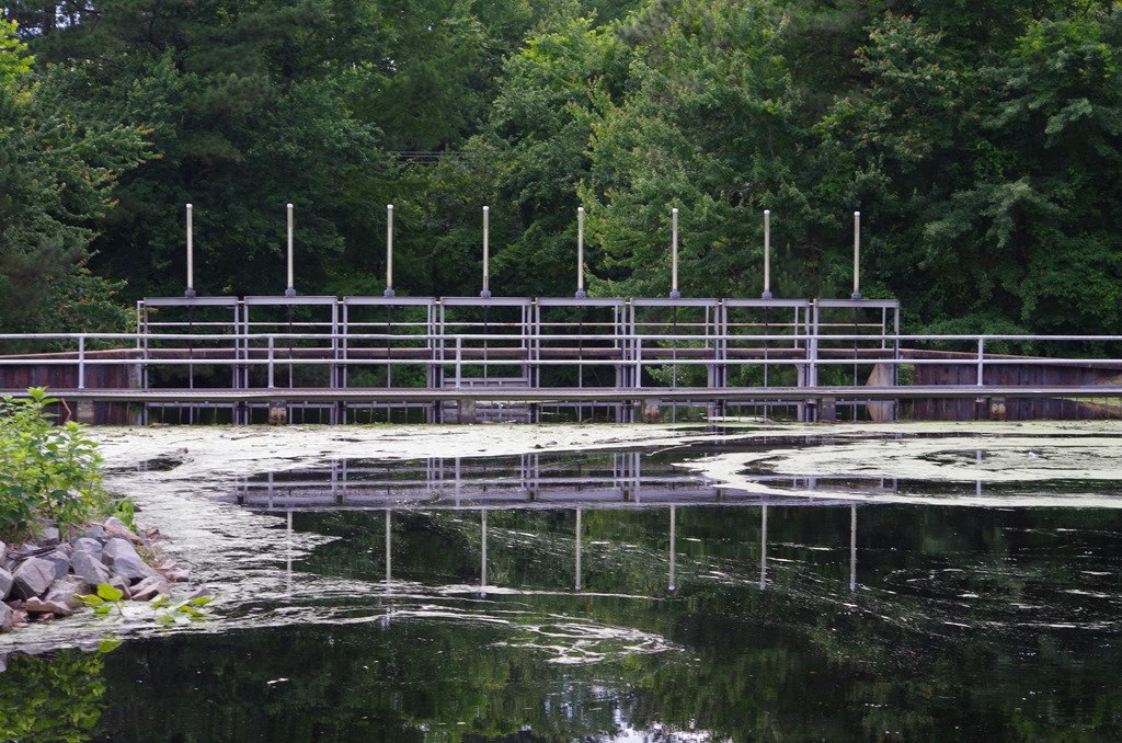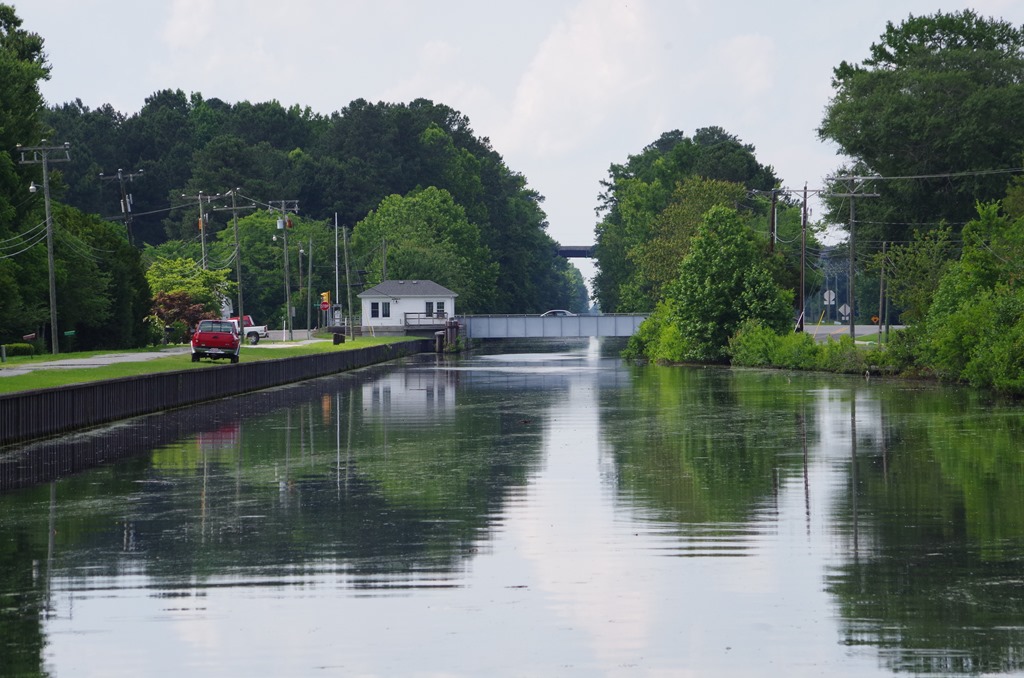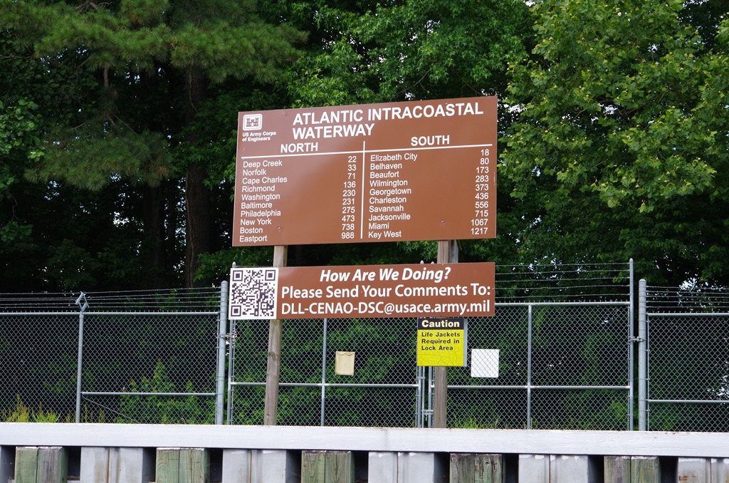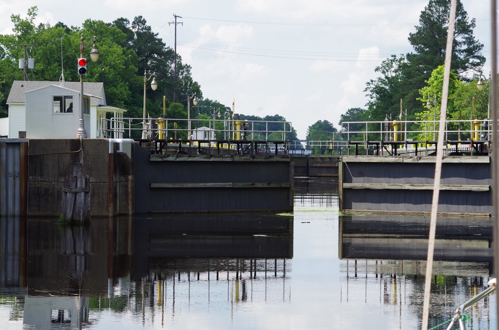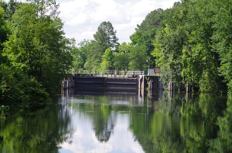 Now, this is the dam on the Dismal Swamp. Doesn’t look like much water was going over. This is one of the two dams that control the water level on the Dismal Swamp Canal that we will travel up.