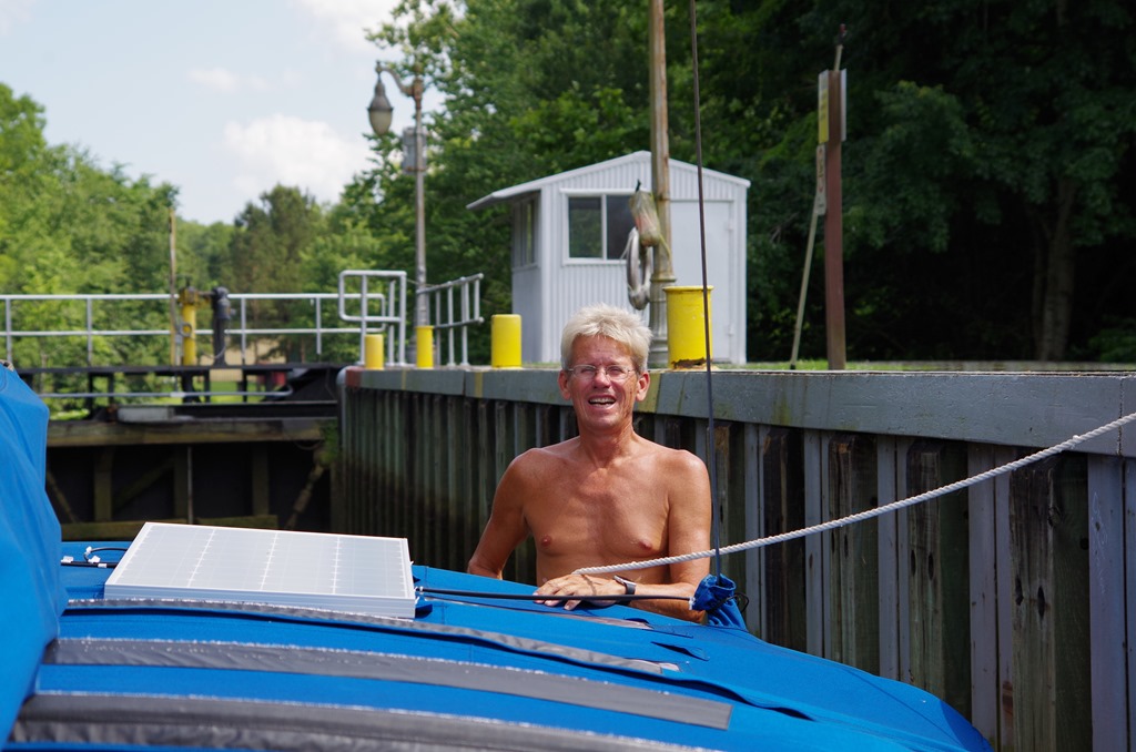 And I took the bow line. I asked Al how much of a rise we will have. He said “Today.. 7 feet”. Notice the water gurgling behind me as it comes into the lock.