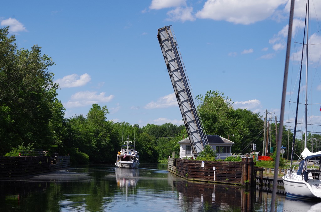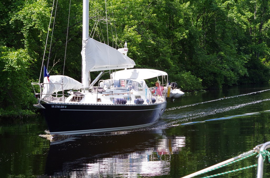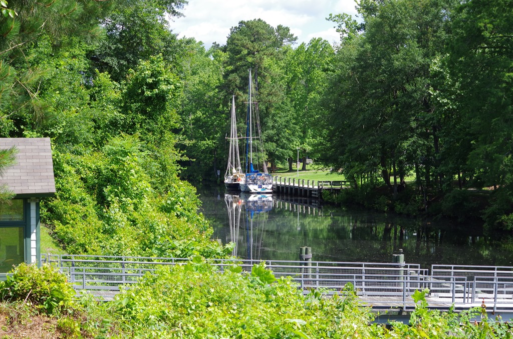 Well we continued up the swamp by boat. It was for the most part a nice trip up the swamp. We hit hard once or twice on the bottom. Bryce marked the position on the GPS so we could let the Army Corp of Engineers know where the bad spots are. The ladies in the office at the rest area at Dismal Swamp Welcome Center said to please mark the GPS coordinates and let them know if you scrap bottom or roll over a tree branch.. They really want to keep the river open to boaters. The depth is strictly regulated at 6 feet. Most of the canal is 8-9 feet. However, a few spots are 6 feet or less. That seems to be where the bumps are. We draft 5’6” to our quite wide wing keel. So we hit most everything.