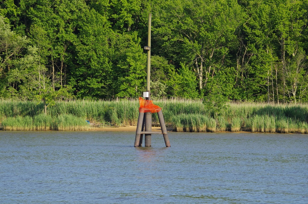 We are merging into the C & D Channel. It was so darn pretty. As we merged in we noticed way to many red buoys. As we got closer, we realized that the pilings running along the river had orange netting on them. I think they could change the color. It is too close to looking like a red buoy.