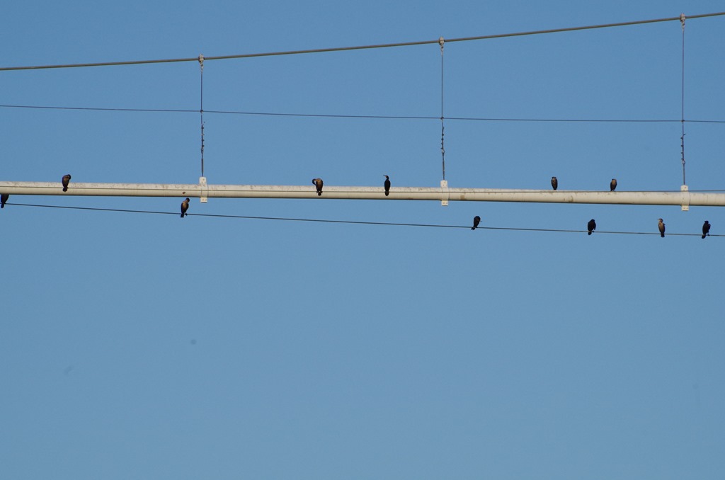 Birds on a wire and pipe looking at the boats and wondering watch one their poop will fall on….LOL