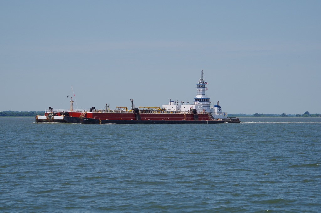 They sure do leave a big wake when they pass in this narrow canal. This is a tow pushing a barge.
