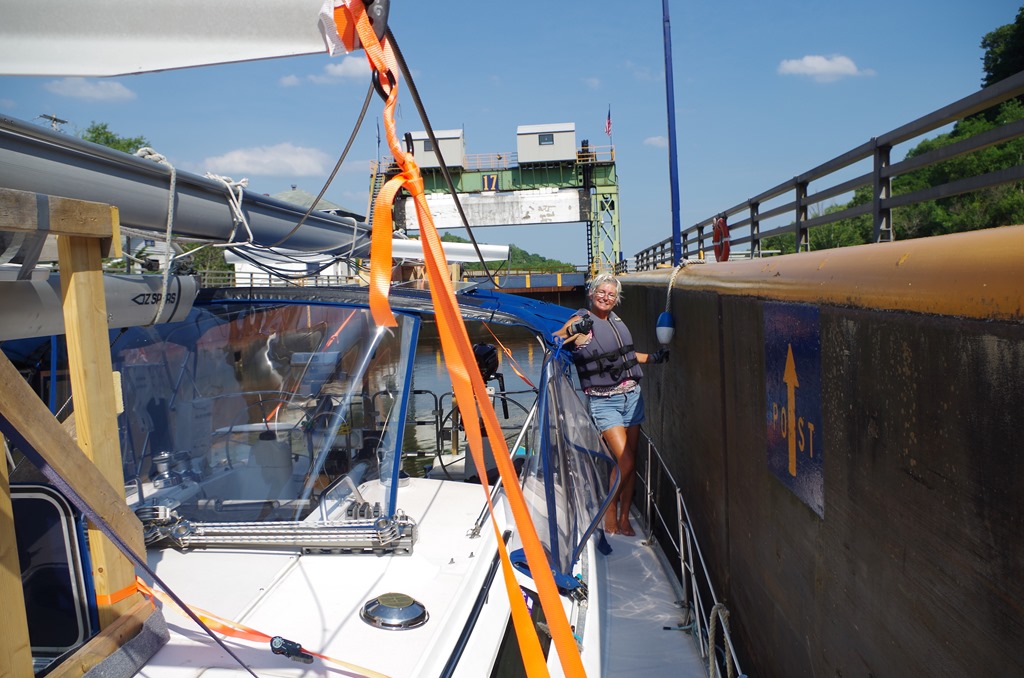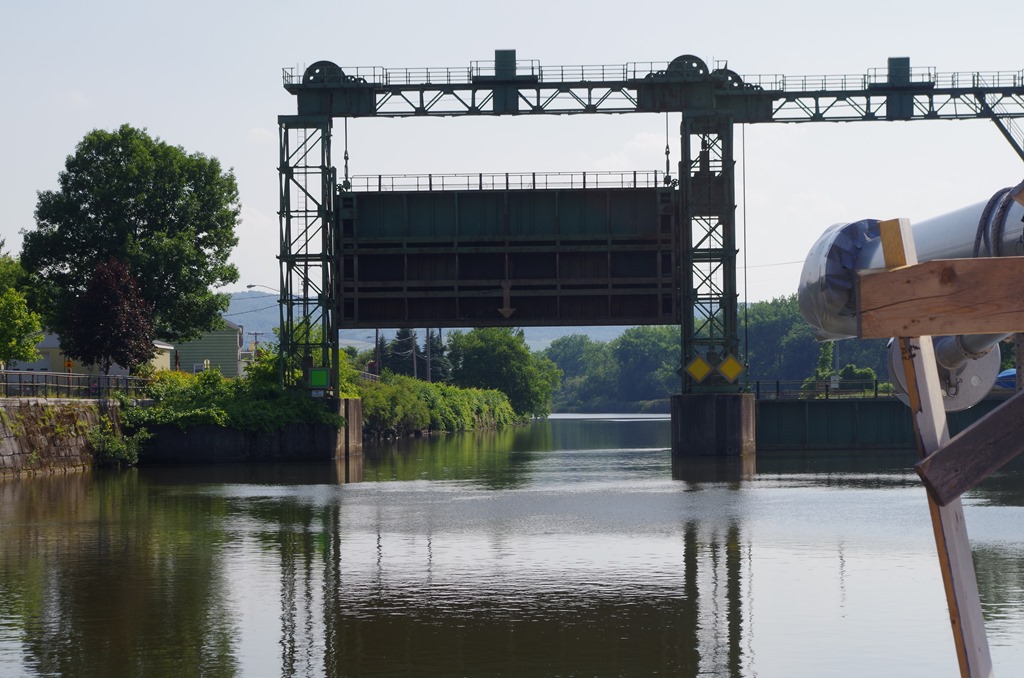 Here is the E-17 Little Falls lock. I was a nervous wreck!! Freaking- out as always of the unknown. I heard this was a difficult lock because of the 40.5 foot lift. Little Falls provides the largest lift in the lock system. It also is unusual because of the guillotine door. This door raises instead of the hinged door. It’s funny because any one on deck will get wet as you enter the lock. The picture below shows the guillotine in the raised position.