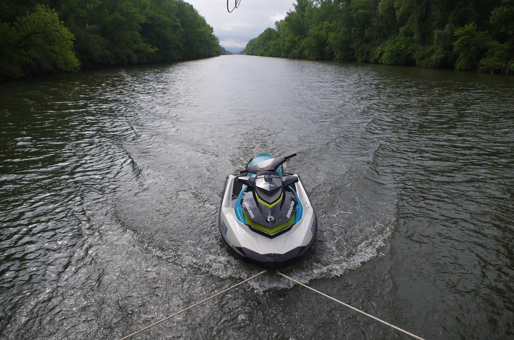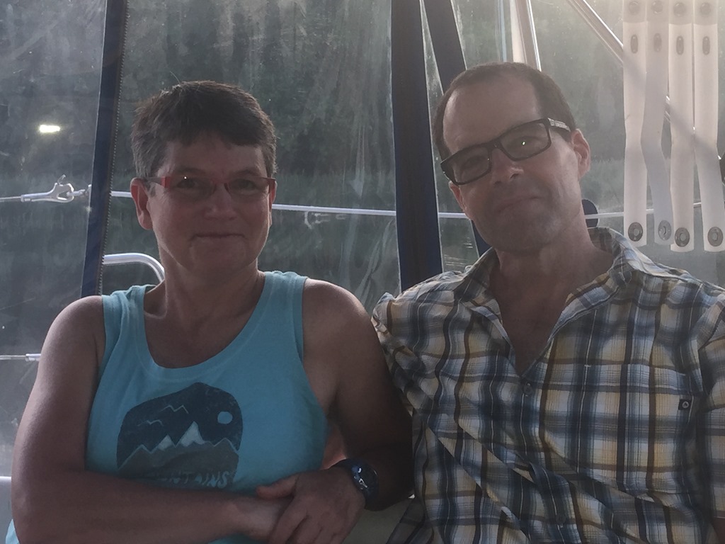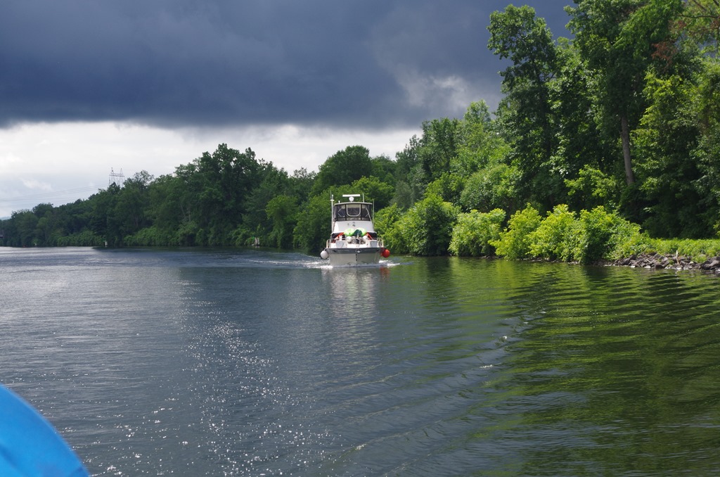 We knew this time we would be sharing the lock with two other power boaters. We were a mile a head of them so we told the lock operator when we contacted him on the VHF that we didn’t mind waiting for them. As we approached the lock we fought gusty winds from behind. It took us a few times to reach our lines on the wall to hold on too. We finally got settled in. We waited for the powerboats to join us. The wind was really gusty. The wind grabbed the first powerboat, a 40 foot cruiser and turned them sideways in the lock. Now these locks are not that big. Bryce tied his line off the springer. The women was yelling at her husband who couldn’t hear her. “I have to let go I can’t hold on any more” her voice trembled in fear. “We are going to hit the sailboat. Go… Go turn us around.. get us out of here” her voice pleaded. But her husband was trying to push the stern of his boat off the other wall. Bryce was sitting off the back of Beauty holding their boat off with his feet. They finally turned around and headed back out of the lock.
