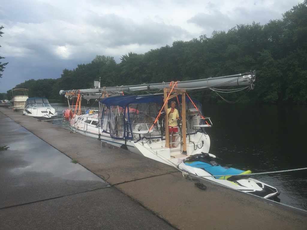 After spending two nights in Little Falls it was time to head out. The forecasters were forecasting rain for the day. I was hoping that it would hold off. Although it was hazy, it was a beautiful morning. Little Falls city docks was very clean. They offered nice clean showers to their guest. We meet a couple ridding a tandem bike from Massachusetts to Iowa. It would be interesting to do that, but my fanny would not allow it. I keep trying new seats, but no luck; so I will stick with sailing. The City docks apparently allows bikers put up their tents for a night. I have to say. They peddle faster then our sailboat. The do between 50-100 miles a day. They average 10 MPH. We do 5 MPH. LOL