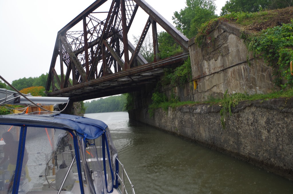 A few miles later we stopped, fueled up and pumped out and we are all set for a while. As we approached lock 19 (Frankfort), we decided to stop for the night. The rain had begun. When we came up on this sign we didn’t know what to expect. But as we turned the corner, there was an over head railroad bridge and lock 19 with hardly any wiggle room for the boat. If you are a boater and are reading this you should wait to pass under the railroad bridge until the lock operator opens the lock. Just in case someone is locking down.