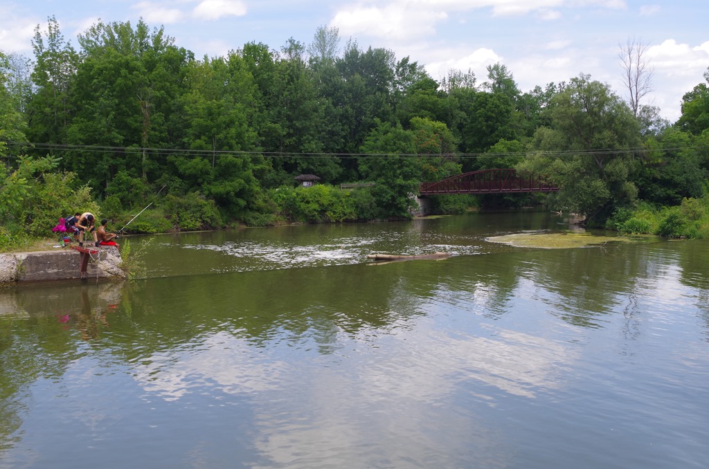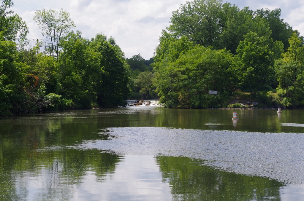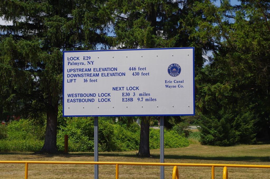 We came upon lock E-29 near Palmyra. Bryce hailed the lock operator and requested the lock open for a lift. As always they responded back and said it would just be a few. He would get the lock ready for us. There was a little fishing boat going through with us. Notice the water bubbling by the door? That is the water coming out as the lock is being lowered. After the bubbles disappear, the doors can be opened. Must also be a good place to fish. We seem to see a lot of people fish near the locks.