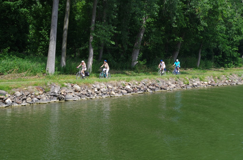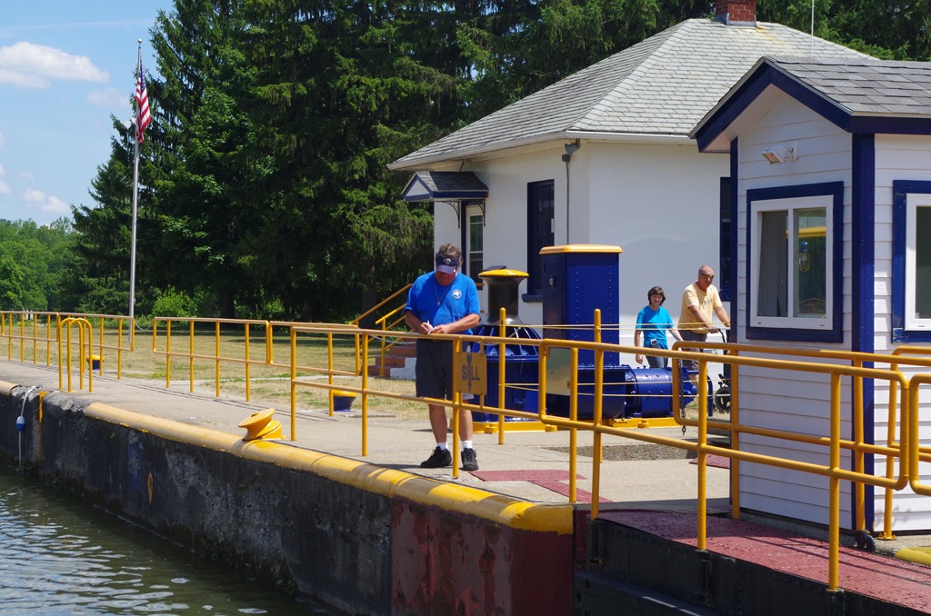 I have to laugh. We travel so slow even the bikes are beating us. These bikers are riding on the bike path at the edge of the canal. The guy in blue was waiting at Fairport to help us tie up!! He had already finished lunch.