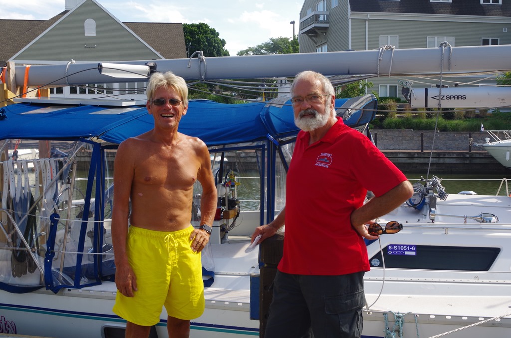 This is Doug; the Fairport Dockmaster. He brought us a package with coupons, maps, and a tinny flashlight in it. Thank you Doug. That was really nice. OH.. See the purple sticker on the window that is our Eire Canal pass.
