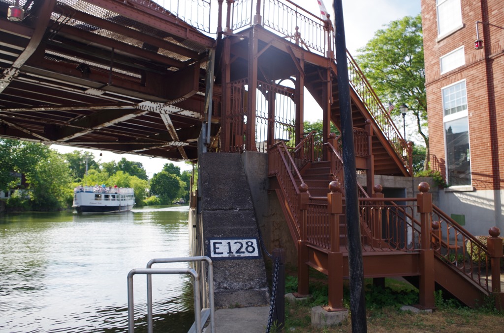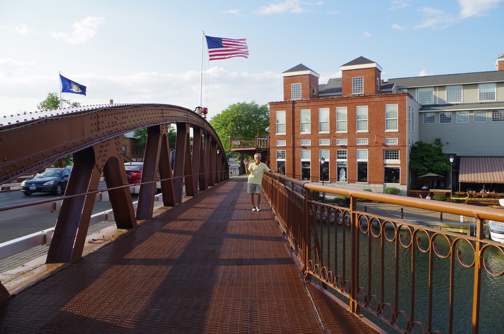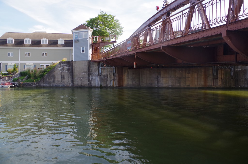 This is so cool. You can actually still walk on the bridge after it rises up. See the stairs going to the top. The stairs allow you to walk on the raised bridge. This is very unique for a raised bridge. You can also see the Colonial Belle (boat) approaching the bridge. Also unique for the bridge is that it tilts down on one side and the two ends are not square, nor parallel. So no 90 degree angles on this lift bridge!! Apparently unique in all the world.