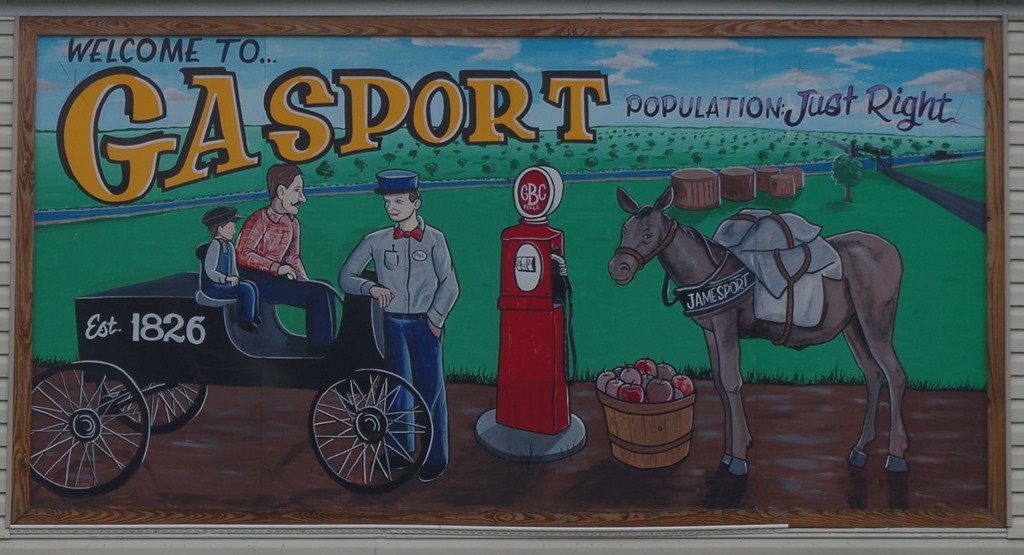 As we came along the bridge to Gasport, we noticed this mural on the building next to the Lift bridge. I love It! “Population: just right”![]()