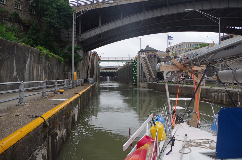 Here it is…. 305 miles of the Erie Canal. We made it to our last two locks. Now these two locks are connected together. We will enter Lock 34 and come out of lock 35. Watch I’ll show you… Now hold on to your hats.