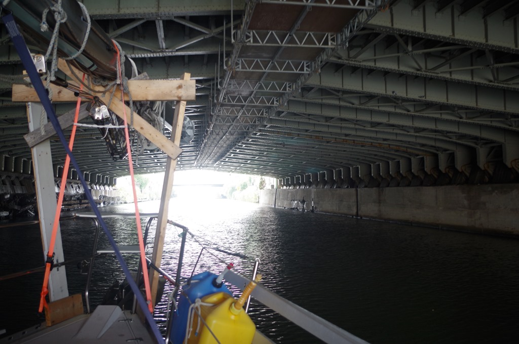 We tied up for the night on the sea wall. Our boat is in the middle of the picture. OM.. what is that concrete hanging in the air over the bridge?? Bryce says it is a counter-weight to help the train bridge open easier. Which makes no sense, since none of the other nearby bridges open!!