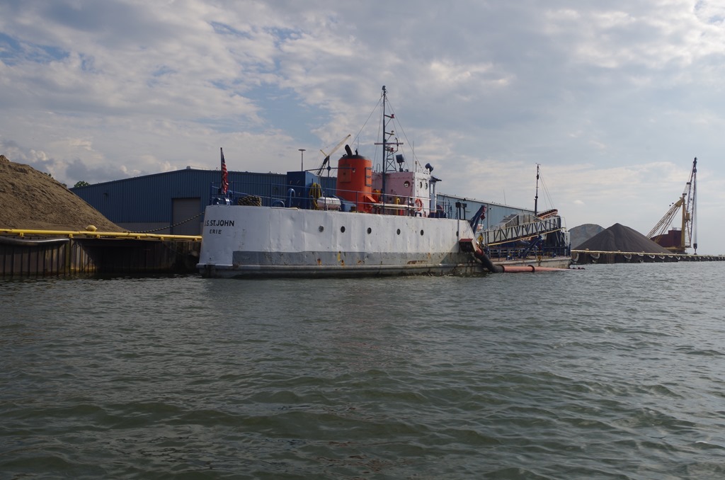 J.S. ST. Huron (Erie) is a dredger. Boy, it looks so narrow. We are so used to seeing the huge barge dredgers. The next day as we left Erie Pa, this vessel was gone. Perhaps she was out making a new path for all of us.