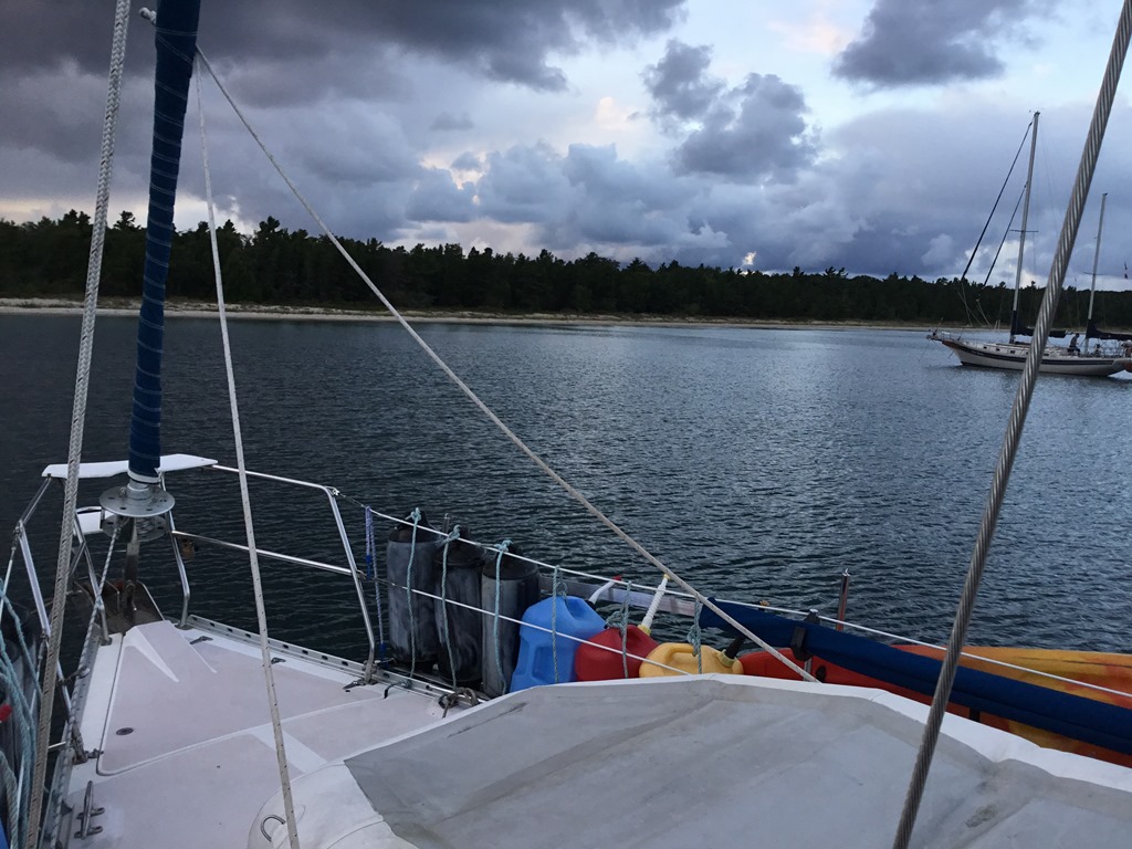 Well our friends, I must say this was a nail biting crossing from Charlevoix to Manitou. We were back into the North West winds. We saw on our wind meter 24.5 knots and of course rain. We were able to make the winds work for us but it was a bit bumpy. Look how much smoother this area is protected by the island. In the morning, we woke up the winds completely from the North; however, we are protected from the winds.. We are staying here till tomorrow then will make a decision where to head next. Here Bryce was able to get a few extra hours in for work. In 2015 we had to pull up anchor from here due to the heavy South winds. South Manitou is a place well worth visiting. You can walk around the island on the trails, see old sunken schooner boats and the Francisco Morazan shipwreck. South Manitou is part of a chain of islands in Michigan that extends to the Straits of Mackinac. You can find out more about this islands by going to the National Park Services website.