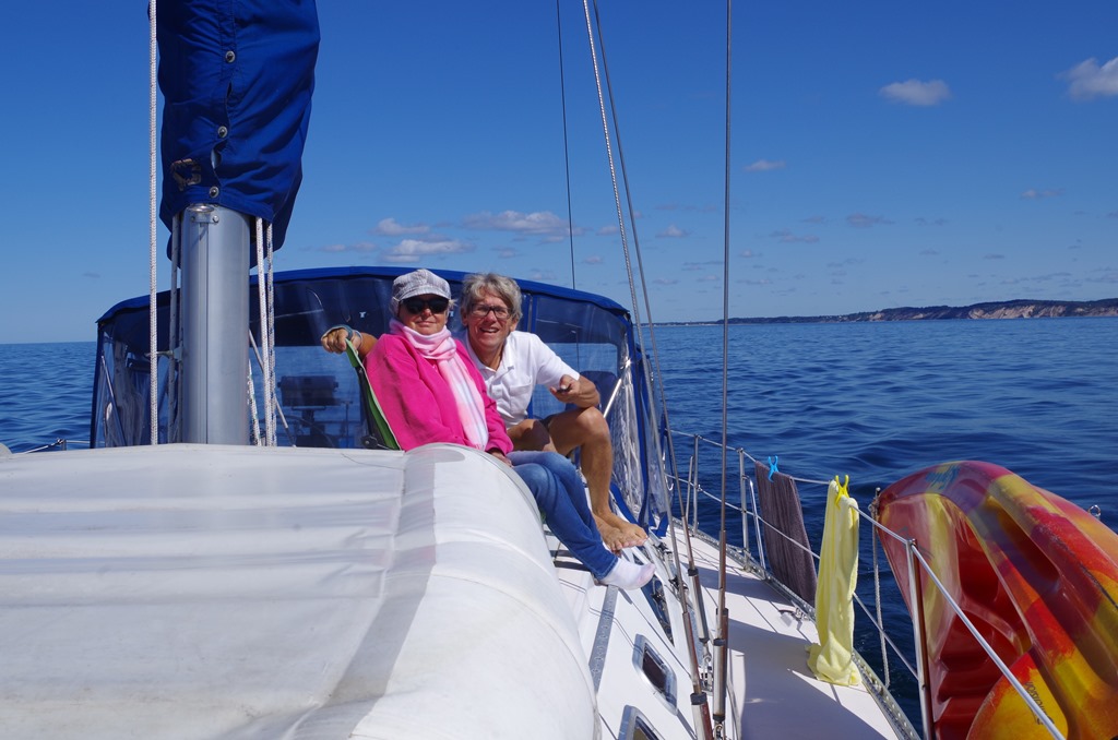 Sometime after noon we headed back out. This time we decided to see what White Lake was like. We have never anchored here. While motor-sailing over there, the sun decided to shine. We sat up on Beauty’s bow. We have waited a long time for this. I was a bit cold… Bryce is hot blooded..he is in shorts…