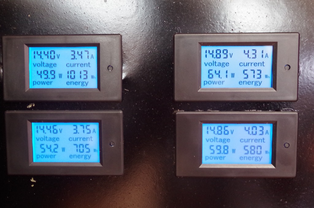 We have 4 one hundred watt solar panels on the bimini. Bryce has never been happy with the single MPPT charger he had. So he now has individual displays and chargers for each panel. He can now monitor voltage, current and power from each panel. This is what the display looks like.