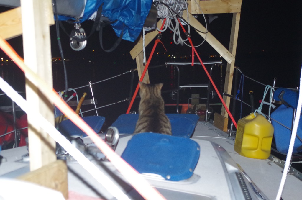 OMG!!! George never ever goes on the bow at night like this. He always waits till we are anchored. I started laughing and called him Prince George. He was overseeing the captains driving. No doubt he could see better than us.