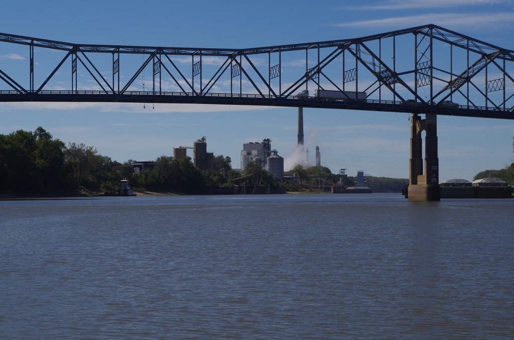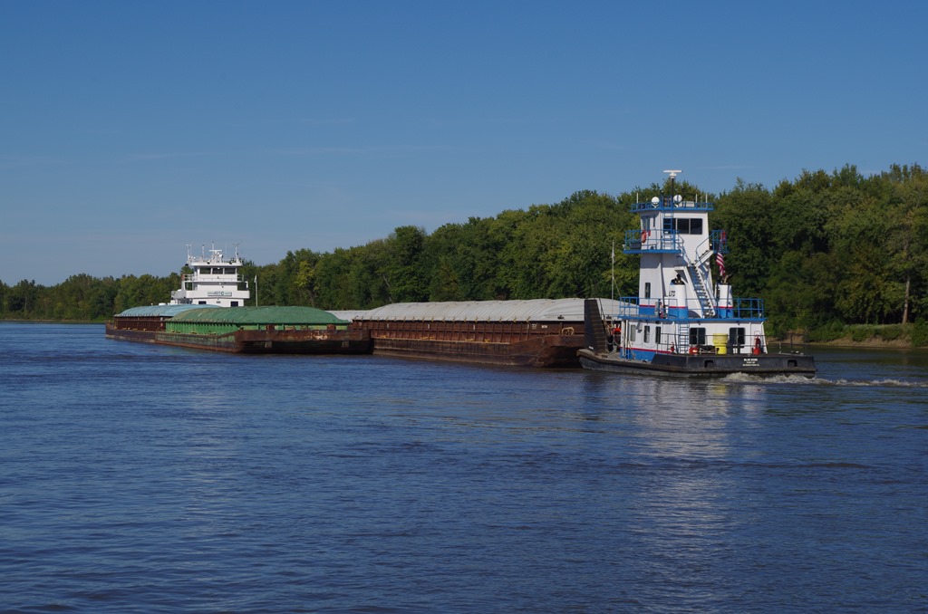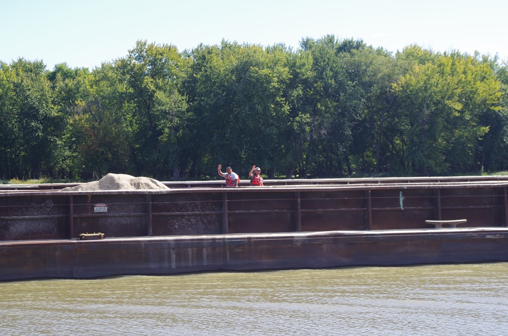 Now this was awesome! At first we didn’t know what was going on. Looked like a “push of war”. The large tow stopped in the middle of the river. Bryce had to radio him to see what side he wanted us to pass on. He replied our portside. It wasn’t till then I noticed a smaller vessel headed towards him from shore. See the smaller vessel at the other end? Anyways the smaller one was removing one of the barges from the Big tow. It was pretty neat to see.