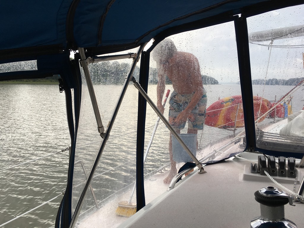 The rain started early this morning. Bryce decided it was a good time to clean the boat during the rain.