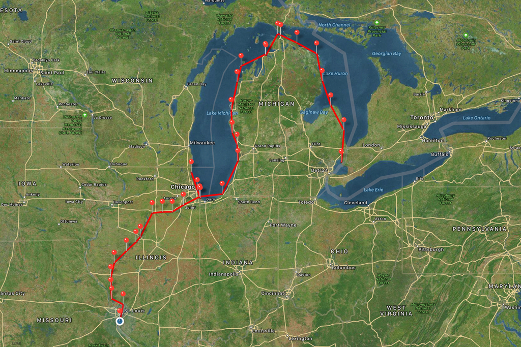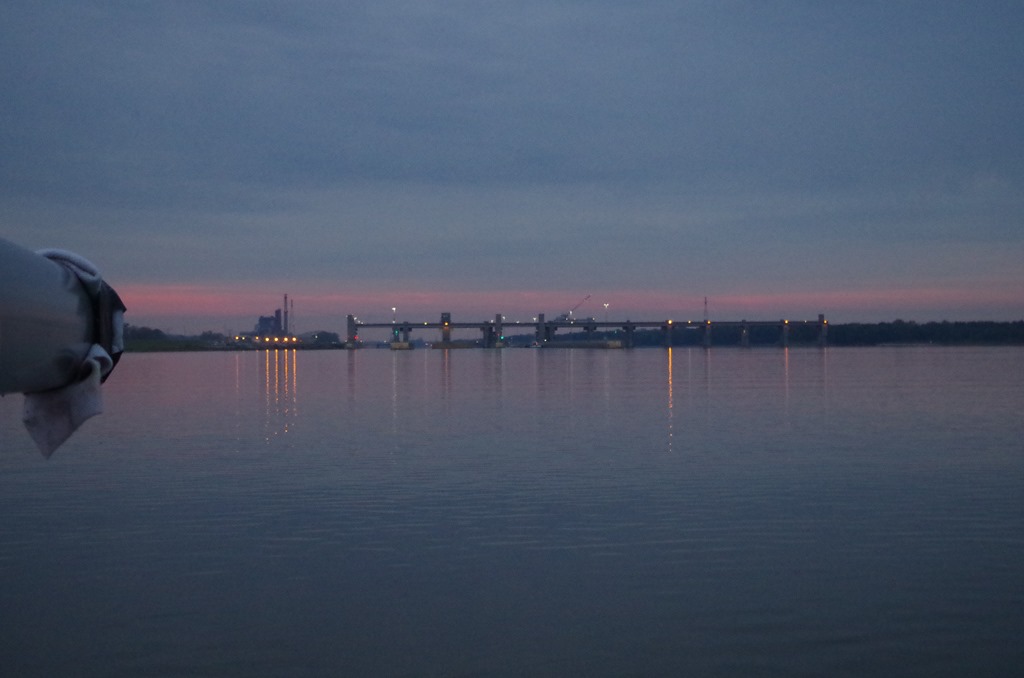 OH My Gosh…What a beautiful morning. We woke up at 1 a.m not able to sleep. Partially because we fell asleep by 7 p.m LOL But it gave us time to get ready to leave Alton. Bryce called the Mel Price Lock the night before. We asked when we should arrive at the lock. We were told to arrive at 7:00 a.m. I think we were both ready to head out of Alton. It always feels good to go into port after 8 days to refurbish our supplies. I have to laugh because normally after 24hrs and we are fully loaded I am ready to go back on the hook. It is sometimes very trying on the hook but it keeps us young and on our toes. Like if the winds shift 180 degrees in the middle of the night to 40 miles per hour and pouring rain, anchor dragging. We must be ready for it. I can’t count the times we have woken up in the middle of the night to a major storm not predicted by the weather person. But with that said it is awesome to anchor out. The following blog is a long one. It’s all in a day of motoring the Mississippi.